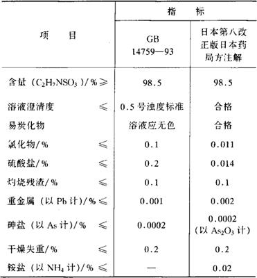 释义 | 牛磺酸 别名 α-氨基乙磺酸 编码 GB 16.000 化学结构 C2H7NSO3 相对分子质量 125.15 性状 白色结晶或结晶性粉末,无臭,味微酸,可溶于水,在乙醇、乙醚或丙酮中不溶。 制法 以α-氨基乙醇与硫酸酯化,经亚硫酸钠还原生成粗品牛磺酸后精制而成。 质量标准 鉴别方法 (1)取本品水溶液(1+20)5mL,加入稀盐酸5滴和亚硝酸钠试液5滴,产生无色气泡。 (2)取本品0.5g,加NaOH溶液7.5mL,缓慢加热蒸发至干,置于500℃高温炉中强热分解2h,向残留物中加5mL水,振摇混匀,过滤,加入亚硝基铁氰化钠试液1滴,产生紫红色。 毒理学依据 1.LD50 小鼠口服大于10g/kg(bw)。 2.Ames试验 无致突变作用。 使用 营养强化剂。 1.使用注意事项 (1)牛磺酸并非组成蛋白质的氨基酸,在人体内以游离状态存在。它对促进儿童,尤其对婴幼儿大脑、身高、视力等的生长、发育起重要作用。 (2)尽管在人体中它可由蛋氨酸或半胱氨酸代谢的中间产物磺基丙氨酸脱羧形成,但婴幼儿体内此种脱羧酶活性很低,其合成受限,而应予补充。特别是用牛乳喂养的婴幼儿,因牛乳中几乎不含牛磺酸,故必须进行适当的营养强化。 2.使用范围及使用量 我国《食品营养强化剂使用卫生标准》(GB 14880-94)规定:可用于乳制品、婴幼儿食品及谷类制品,使用量为,0.3~0.5g/kg;饮液、乳饮料,0.1~0.5g/kg;配制酒;0.1~0.5g/kg;儿童口服液,4.0~8.0g/kg。 |