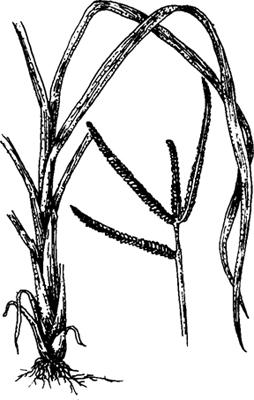 〔形态特征〕 一年生草本,高15~90厘米。秆丛生,多铺散成盘状,斜生或仰卧,有时近直立,不易拔断。叶鞘压扁而具脊,鞘口具柔毛;叶舌短;叶片条形。花序穗状2~7枚,呈指状排列于秆顶,有时其中1或2枚单生于花序的下方;小穗含3~6花,成双行密集于穗轴的一侧;颖和稃均无芒,第一颖短于第二颖,第一外稃具3脉,有脊,脊上具狭翅,内稃短于外稃,脊上具小纤毛。颖果长卵形。