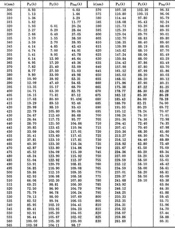 释义 | 物体色的计量标准及量值传递 这里所说的物体是指自身不发光,靠光源照明后才看得见它的颜色,包括透明物质或不透明物质。物体的颜色是物质的一种属性,有利于人们认识物体和区分物体。从物体反射或透射出来的光的成份,已不同于照明光的光谱成份,因此,物体的颜色取决于:(1)光源的光谱成分,用光源的相对光谱功率分布P(λ)表示;(2)物体对光的反射或透射特性,用光谱反射比ρ(λ)或光谱透射比τ(λ)来表示;(3)光源照明物体时的入射角度和观察物体的角度。 为了使颜色测量结果具有可比性,国际照明委员会规定了几种标准照明体,分别以A、B、C、D来命名: 标准照明体A——是温度为2856K的黑体辐射光,它的相对光谱功率分布可以用普朗克公式计算出来。当然它的色温也是2856K。色温为2856K的钨丝白炽灯被规定为实用的A光源。 标准照明体B和C——分别代表相关色温为4874K的直射阳光和6774K的平均昼光,实用上的B光源和C光源是由A光源分别配上一个特殊的液体滤光器而得到的。CIE已建议取消这两种标准光源,但在某些产品的标准中,在表示产品的颜色参数时,仍使用C光源下的色坐标值。 标准照明体D——也称为重组昼光,用D55,D65,D75来代表相关色温分别为5504K,6504K和7504K的标准照明体,并建议尽可能多使用D65。总之,在灯光下的物体色计量应使用标准照明体A,在昼光下则应选用标准照明体D65,表9.5-4是这几种标准照明体的相对光谱分布函数,在波长560mm处归一化为100.00。 表9.5-4 A、C和D65标准照明体的相对光谱功率分布 为了使颜色测量标准化,国际照明委员会推荐了几种标准的几何条件,规定了对样品的照明方式和观察样品的方向。对反射样品来说有以下四种: (1)照明光束与样品表面的法线成45°角入射,观测方向与法线一致,记号为45/0; (2)照明光束垂直照射到样品表面,在与法线成45°角的方向上进行观测,记号为0/45; (3)样品被漫射光照明,即表面被来自各个方向的光照明,在样品的法线上进行观测,记号为d/0; (4)样品被光束垂直照射表面,收集从表面反射的所有方向上的反射光,记号为0/d。 对透射样品也规定了如下几种标准条件: (1)光线垂直于样品的表面入射,透过样品后,在垂直于样品表面的方向接收透射光,记号0/0; (2)样品被漫射光照明,在样品的另一侧接收所有方向上的透射光,记号为d/d; (3)光线从样品的一侧垂直入射,在样品另一侧接收所有漫透射光线,记号为0/d,与此等效的是样品被漫射光照明,在另一侧与样品表面垂直方向上接收透射光线,记号为d/0。 计算样品三刺激值的公式9.5-1变为 式中P(λ)为标准照明体的相对光谱功率分布,可选A,D65或其他标准照明体中的一种;φ(λ)为用某种标准几何条件测出的样品的光谱反射系、光谱透射系数或光谱亮度因数(对45/0或0/45条件来说),光谱亮度因数是样品在各个波长上的亮度与完全漫反射体的亮度之比;K为归一化系数,若令 当色匹配函数用10°视场的 对于反射样品,色度计量的传递标准是反射标准色板(包括标准白板),根据不同用途,由不同材料制成。标准白板可用硫酸钡、氧化镁或海伦等粉末压制而成,或用陶瓷、搪瓷、乳白玻璃等材料制成。标准色板用陶瓷、搪瓷、金属、织物、纸板、塑料等制成,一般制成圆形、方形、矩形,应具有一定厚度和一定的机械强度,表面平整,颜色均匀,每套由五至七块不同颜色的色板组成。 标准白板和标准色板的光谱反射比,是由计量部门标定的。根据光谱反射比数据及选定的标准照明体(A或D65)、标准匹配函数(2°视场或10°视场)计算三色刺激值和色坐标。表9.5-5为一、二级标准色板的允许误差,其中ΔY是反射系数的误差,并规定完全漫反射体的Y值等于100。 表9.5-5反射标准色板 各行业有适应本行业需要的标准色卡,如纺织印染行业有由各种织物染成的色卡,印刷行业有用油墨在纸张上印制的色卡,油漆涂料行业有用各种彩色油漆喷涂在纸板、木板或金属板上的色卡。这些色卡的色坐标值,都应溯源到标准色板上去。 白度在造纸、纺织、印染等行业,以及米、面等粮食制品行业广泛使用,白度计也是颜色测量仪器的一种。国际推荐的白度W由下式计算: W=Y+800(xn-x)+1700(yn-y) (9.5-7) 式中xn,yn是完全漫反射体的色坐标,x,y是样品色坐标,Y是样品的刺激值,所有色坐标都用D65标准照明体,2°或10°视场的标准色匹配函数来计算。 在样品的反射率很低时,谈论白度是没有意义的,故规定W值的范围: 40<W<(5Y-280) (9.5-8) 此外,在样品明显带有某种色调时,则应该用色度而不是白度来描述样品,故规定样品的色泽TW由下式计算: TW=1000(xn-x)-650(yn-y) (9.5-9) 当-3<TW<3时,才可用式9.5-7来评价白度。 检定白度计用一套专用的标准白板,这些标准白板在可见光谱范围内的光谱反射比应平坦、无光谱选择性。每套标准白板由四块组成,其光谱辐亮度系数分别为:>87%,(82±4)%,(73±4)%和(65±4)%。白度计按其示值误差的大小分级,一、二、三级白度计的示值误差分别为±1,±1.5和±2.5。 【参考文献】: [1]现代计量学概论,鲁绍曾主编,中国计量出版社,1987。 [2]现代计量测试技术,王江主编,中国计量出版社,1990。 [3]光度学,郝允祥等编着,北京师范大学出版社,1988。 [4]色度学,荆其诚等编着,科学出版社1979,。 [5]Principles Governing Photometry,Metrologia,19,97-101,1983. [6]Accurate Measurement and Correction for Nonlinearities in Radiometers,J.Res.NBS,67A,1972. |