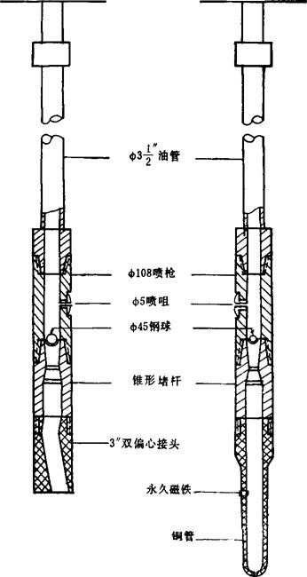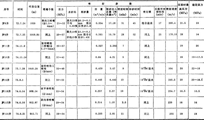释义 | 特殊压裂工艺 (一)水力喷砂射孔压裂 1.用途 降低岩盐层的破裂压力值,提高压裂连通的成功率。 2.特点 喷射孔道深,在石灰岩地层中可达0.4m左右,在岩盐层内可达0.5~0.8m;孔眼大,一般在套管上为18~21mm,在岩层中为50~70mm;孔眼规则,射孔时无震动,一般不会损伤套管和水泥环。见图3-3-50。 图3-3-50 水力喷射所造成孔道的纵剖面示意图 3.常用的喷射压裂的管柱结构 通常由油管、高压水力锚、短节、高压封隔器、定压凡尔、喷射器、球座等组成,见图3-3-51。 图3-3-51 喷砂射孔压裂管柱结构示意图 1-油管 2-高压水力锚 3-短节 4-高压封隔器 5-高压凡尔 6-喷砂射孔器 7-球座 4.水力喷砂射孔压裂工艺流程 见图3-3-52。 图3-3-52 压裂施工井场布置图 1-压裂车 2-供水车 3-加砂车 4-管汇车 5-水罐 6-砂堆 7-井口 5.喷嘴结构 现用硬质合金拔丝模铆到软钢胎体中的方法制作,表面堆焊钨钢粉作为防护层。其结构如图3-3-53,主要由聚流段和圆柱段两部分组成。 图3-3-53 喷嘴示意图 根据实践,在现有设备能力条件下,主要部分尺寸为: 喷嘴直径 d=3.5~4.5mm 圆柱段长度 L=2.5~3d 聚流段弯曲半径 R=15~17mm 6.下井管串要求 管串要试泵压,防止施工时丝扣渗漏刺断;喷砂射孔枪上部应配备反循环凡尔和足够的水力锚;喷嘴表面与套管的间隙一般应大于10mm。 7.施工参数 砂子直径:0.25~0.5mm 悬砂液:一般使用的有清水或粘度为30s左右的CMC(碱性羧甲基纤维素钠盐)溶液。 混砂比:8~13%(体积百分比) 喷射速度:200m/s左右 喷射时间:25~30min 8.砂子与悬砂液 (1)砂子用量=总孔数×喷嘴流通面积×喷射速度×施工时间×含砂比×砂子视比重(施工中一般多准备10%,作为损耗)。 (2)悬砂液用量=总孔数×喷射时间×喷射速度×喷嘴流通面积+井筒容积×循环或冲砂的总次数(在有沉砂和回收悬砂液装置时,可酌情减少)。 (3)对砂子要求 需用纯净的石英砂。原砂经水洗、烘干、大小两次筛选处理,方可使用。 9.喷砂射孔枪 可用单级或多级枪进行射孔。每级枪沿圆周均匀分布3个或4个喷嘴,每支枪一般可射1~2排孔。使用时,分投不同直径的钢球,使各级枪自下而上的逐次进行工作,见图3-3-54。喷砂射孔器推荐参数见表3-3-33。 图3-3-54 喷砂射孔枪 1-主体 2-紫铜垫片 3-喷嘴体 4-油管 表3-3-33 喷砂射孔器推荐参数(中深井) 喷射时62mm( 图3-3-55 λ自伸-油管自重伸长 λ320、λ300、λ250、λ200-施工压力在32、30、25、20MPa下的油管受压伸长 油管总伸长=λ自伸+λ加压伸长 (二)水力定向、定位喷射压裂 水力定向喷射压裂,是采用单向喷嘴(或喷枪)向一个方向进行喷射压裂。水力定位喷射压裂,是采用旋转喷枪,在设计的位置进行旋转喷射压裂。 1.用途 (1)先期建槽,相对保护岩盐层顶板,降低岩盐层的破裂压力; (2)进行定向或定位水力喷射; (3)提高压裂连通的成功率。 2.特点 (1)采用饱和盐水作压裂液; (2)采用偏心弯接头或嵌磁法定向; (3)采用单向三喷嘴,旋转喷枪,水平单喷枪,斜向单喷嘴等方法进行喷射。 3.主要参数(根据威西岩盐体试验数据) (1)喷射压力 30~34MPa (2)喷射速度 220~290m/s (3)喷射时间 9~13min (4)喷射时排量0.3~0.5m3/min 威西岩盐体水力喷射试验数据,见表3-3-34。 表3-3-34 威西岩盐体水力喷射试验数据 两种井底定向法的管串结构组合示意,见图3-3-56。 (1)偏心弯接头定向管串组合 (2)嵌磁法定向管串 图3-3-56 两种井底定向管串结构组合示意图 |