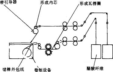 释义 | 特种滤棒成型 (一)通风槽滤棒成型 1.工艺任务 将合乎质量要求的醋酸纤维丝束加工成能满足滤嘴卷烟及生产要求的通风槽滤棒。 2.加工方法 通风槽滤棒的加工工艺过程见图7-9-3。 图7-9-3 通风槽滤棒加工工艺过程示意图 (1)一组醋酸纤维丝束经开松,展幅及施加增塑剂后,在卷制中形成滤材内芯。 (2)另一组醋酸纤维在开松,展幅及施加增塑剂后,再通过一对加热的瓦楞成型压辊形成纵向带,瓦楞连续带作为滤材外圈。 (3)在卷制设备上用高透滤棒卷纸将内芯和外圈卷制,再经封搭口及分切即得到所需的通风槽滤棒。 (二)无包纸滤棒成型 1.工艺任务 将合乎质量要求的醋酸纤维丝束加工成能满足滤嘴卷烟及生产要求的无卷纸的滤棒。 2.加工方法 类同醋酸纤维滤棒,但在施加增塑剂后导向收缩时在滤芯的外层再施加一层胶,卷制时不用卷纸,而是采用“加热式烟枪”使外层胶在烟枪高温下凝固、定型,再经过分切即得到所需的无包纸滤棒。 |
