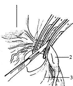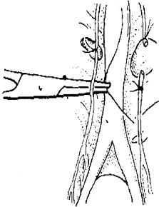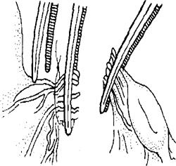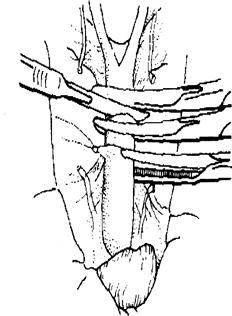 释义 | 犬、猫卵巢子宫切除术 【适应症】雌性犬、猫的绝育,5~6月龄是手术适宜时期;成年犬、猫在发情期、怀孕期不能进行手术。卵巢囊肿、肿瘤、子宫蓄脓经一般治疗无效,子宫肿瘤或伴有子宫壁坏死的难产、糖尿病、乳腺增生和肿瘤等的治疗。注意不能与剖腹产同时进行;单纯的绝育手术只需摘除卵巢而不必切除子宫。 【术前准备】术前禁饲12h以上,禁水2h以上,进行全身检查;对因疾病进行手术的动物,术前应进行适当的对症治疗。 【保定和麻醉】全身麻醉,仰卧保定。 【术式】 1.脐后腹中线切口,切口的大小依动物个体大小而定,显露腹腔;用小创钩将肠管拉向一侧,当膀胱积尿时,可用手指压迫膀胱使其排空,必要时可进行导尿和膀胱穿刺。 2.术者手伸入骨盆前口找到子宫体,沿子宫体向前找到两侧子宫角并牵引至创口,顺子宫角提起输卵管和卵巢,钝性分离卵巢悬韧带,将卵巢提至腹壁切口处。 3.在靠近卵巢血管的卵巢系膜上开一小孔,用三钳钳夹法穿过小孔夹住卵巢血管及其周围组织,然后在卵巢远端止血钳外侧0.2cm处用缝线作一结扎,除去远端止血钳(图2-25),或者先松开卵巢远端止血钳,在除去止血钳的瞬间,在钳夹处作一结扎;然后从中止血钳和卵巢近端止血钳之间切断卵巢系膜和血管(图2-26),观察断端有无出血,若止血良好,取下中止血钳,再观察断端有无出血,若有出血,可在中止血钳夹过的位置作第二次结扎,注意不可松开卵巢近端止血钳。 图2-25 三钳钳夹法结扎卵巢血管 1.肾脏 2.卵巢 3.卵巢系膜 图2-26 在松钳的瞬间结扎卵巢血管 4.将游离的卵巢从卵巢系膜上撕开,并沿子宫角向后分离子宫阔韧带,到其中部时剪断索状的圆韧带,继续分离,直到子宫角分叉处。 5.结扎子宫颈后方两侧的子宫动、静脉并切断(图2- 27),然后尽量伸展子宫体,采用上述三钳钳夹法钳夹子宫体,第一把止血钳夹在尽量靠近阴道的子宫体上。在第一把止血钳与阴道之间的子宫体上作一贯穿结扎,除去第一把止血钳,从第二、三把止血钳之间切断子宫体(图2-28),去除子宫和卵巢,松开第二把止血钳,观察断端有无出血,若有出血可在钳夹处作第二针贯穿结扎,最后把整个蒂部集束结扎。如果是年幼的犬猫,则不必单独结扎子宫血管,可采用三钳钳夹法把子宫血管和子宫体一同结扎。 图2-27 贯穿结扎子宫血管 图2-28 三钳钳夹法切断子宫体 6.清创后常规闭合腹壁各层。 【术后护理】创口处作保护绷带,全身应用抗生素,给予易消化的食物,一周内限制剧烈运动。 |