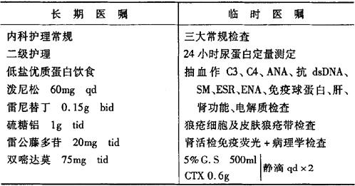 释义 | 狼疮性肾炎 说明:(1)急性活动期应卧床休息。 (2)激素的应用应遵守“早期、足量、足疗程、减量慢”的原则,甚至终身用药。 (3)CTX 0.4~0.6g/日,连续2天,每15天一次,累积总量≤150mg/kg,后每3个月一次,连续2天,直至狼疮性肾炎稳定1~2年可停药。 (4)狼疮性肾炎晚期需透析或肾移植。 (5)狼疮性肾炎临床表现为急进性肾炎、难治性肾病综合征,伴高热,或出现神经精神症状,主张用甲泼尼龙冲击治疗。 |