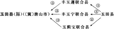 ①1912年称玉田县;1940年在丰润、玉田、遵化三县接壤地区建立丰玉遵联合县,在丰润、玉田、宁河三县接壤地区建立丰玉宁联合县。②1943年在玉田、蓟县、宝坻三县接壤地区建立玉蓟宝联合县。③1946年撤销三个联合县,恢复玉田县。