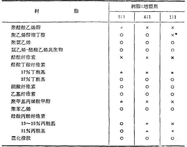 O=相容 x=不相容 △=部分相容 *薄膜透明,但渗出