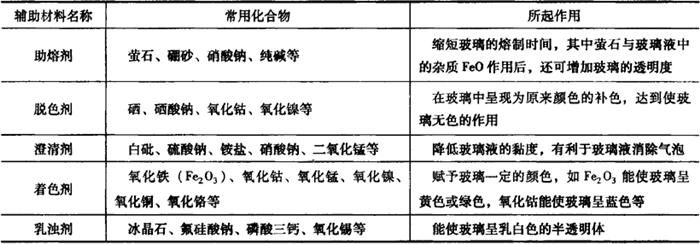 为改善玻璃的某些性能,在玻璃的生产过程中还需加入一些辅助原料,以满足多种使用的要求。如加入着色剂,可将玻璃制成多种绚丽多彩的彩色玻璃;加入澄清剂,可降低玻璃的黏度,有利于玻璃液消除气泡。