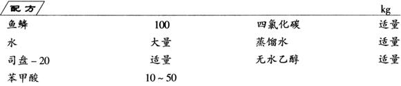 将鱼鳞晒干后,用清水冲洗干净,滤干备用。在容器中加入水(为鱼鳞质量的6~8倍),加热至40~50℃,再加入适量表面活性剂,在搅拌下加入鱼鳞,保温半小时左右。去除鱼鳞,于水溶液中加入苯甲酸,充分搅拌后,让其静置、沉淀。然后过滤除去沉淀物,得乳白色滤液。再经离心分离得到珍珠精初品。
