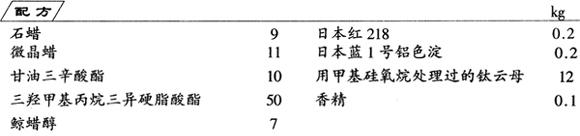 将蜡、酯、醇组分混合,加热至70℃,然后加入颜料和钛云母,最后加入香精,充分混合均匀后,趁热注入模型,冷却后,即为成品。