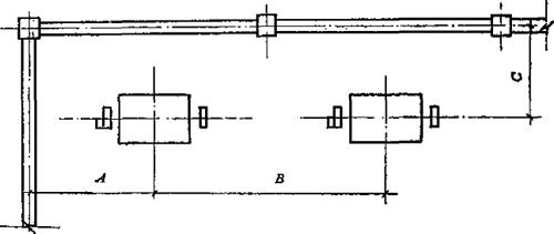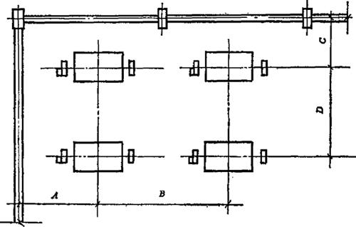 释义 | 球磨机布置 (一)一排布置(图7-15) 图7-15 单排球磨机布置图 图中 A=4.5mB≥5.5m(1t球磨机)或B≥6m(1.5-2t球磨机):C=2.5-3m(视具体情况而定)。 (二)二排布置(图7-16) 图7-16 双排球磨机布置图 图中 A=4.5m;B≥6m(1.5-2t球磨机);C=2.5-3m;D》6m(地轴联动时,D≥7m)。 |
