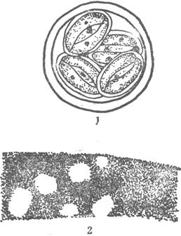 1.青鱼艾美虫 2.患球虫病鲤鱼的一段肠
