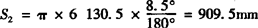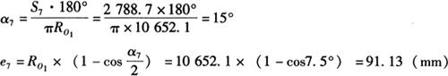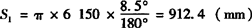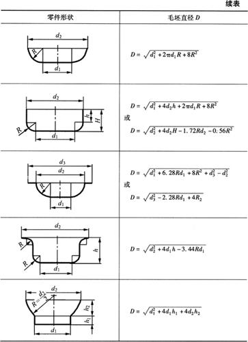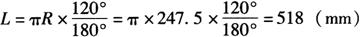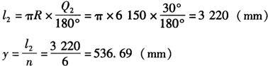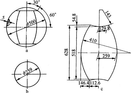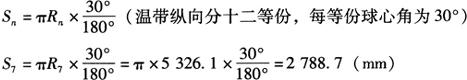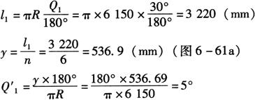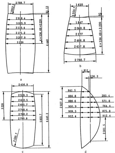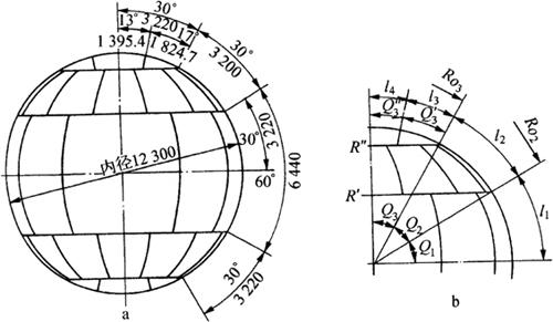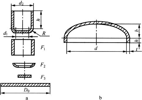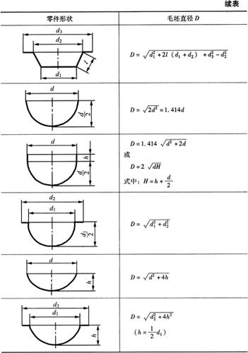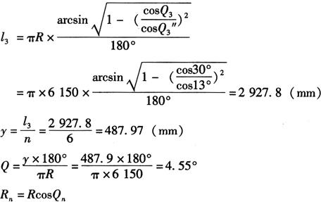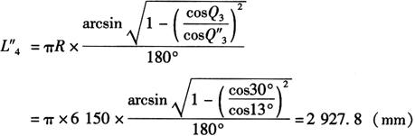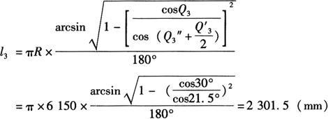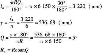 释义 | 球面构件的计算展开 (一)小型三瓣球体构件的计算展开 图6-60a为装饰用不锈钢球体。根据其尺寸和制造工艺要求,球体等分成三块瓜瓣且分别成型,再拼接成整体。因此,每块瓜瓣须计算展开的具体方法如下: 图6-60 小型三瓣球体的计算展开(单位:mm) a.主视图 b.顶圆展开图 c.1/3瓜瓣展开图 1.有关参数的计算 即顶端展开半径R0、顶圆处纬圆半径r、瓜瓣上端1/2弧长S1中部1/2弧长S2、上端弦高e和半弦长B0,以及纵向弦长B等参数的计算如下: R0=Rtan30°=247.5×tan30°=143(mm) r=Rsin30°=247.5×sin30°=124(mm) S2=πr/n=π×247.5/3=259(mm) 展开料上端所对半圆心角α1: e=R0×(1-cosα1)=143×(1-cos51.92°)=54.8(mm) B0=R0sinα=143×sin51.92°=112.6(mm) 2.展开尺寸的计算 (1)瓜瓣料长的计算: (2)瓜瓣侧弧弧长及半径的计算: B=L+2e=518+2×54.8≈628(mm) 根据相交弦定理可得 (3)顶圆直径的计算展开: (二)大型球罐构件的计算展开 图6-61为橘瓣式球形贮罐,球壳由对称分带分块拼焊而成,其已知尺寸和计算原理如图6-61b所示。 图6-61 1000m3橘瓣式球罐的计算(单位:mm) a.主视图 b.计算原理图 1.赤道带的计算展开 (1)相关参数计算:如图6-61b和图6-62a所示,需计算的相关参数有半纵向中心弧长l1、纵向每等份弧长y、每等份所对球心角Q′1、各等分点所处截圆半径Rn和各等分点横向弧长Sn等,计算如下: 图6-62 1000m3橘瓣球罐展开(单位:mm) a.赤道带展开图 b.温带展开图 c.极带中央板展开图 d.极带边板展开图 Rn=RcosQ′1 其中 R1=6150mm,R2=6126.6mm,R3=6056.6mm,R4=5940.4mm,R5=5779.1mm,R6=5573.8mm,R7=5320.1mm。 赤道带纵向分十二横向瓣片,每片球心角为30°,得S1=3220mm,S2=3207.9mm,…,S6=2918.4mm,S7=2788.7mm。 (2)展开尺寸计算:如图6-61和6-62a所示,上口展开半径RO1、上端弧所对顶角α7和弦高e7的计算如下: RO1=Rtan(Q2+Q3)=6150×tan60°=10652.1(mm) 2.温带的计算展开 (1)相关参数计算:如图6-61b和图6-62b所示,相关参数有纵向中心弧长l2、纵向角等分弧长y、每等份所对球心角Q′2、各等分点所处截圆半径Rn及各等分点横向弧长Sn等,计算如下: 其中 R7=6150×cos30°=5326.1mm,R8=6150×cos35°=5037.8mm,R9=4711.2mm,R10=4348.7mm,R11=3953mm,R12=3527.5mm,R13=3075mm。 同理,得S8=2637.8mm,S9=2466.8mm,S10=2277mm,S11=2069.8mm,S12=1847mm,S13=1610mm。 (2)展开尺寸计算:如图6-61b所示,上口展开半径RO2、上端弧所对顶角α13、上口弦高e13的计算如下: RO2=RtanQ3=6150×tan30°=3550.7(mm) 3.极带中央板的计算展开 相关参数如半纵向中心弧长l4、纵向每等份弧长y、每等份所对球心角Q、各等分点所处截圆半径为Rn、各等分点横向弧长Sn及端口半径RO2和边沿半弧长l″4等(图6-62c),计算如下: 其中 R1=6150mm,R2=6150×cos5°=6126.6mm,R3=6056.6mm,R4=5940.45mm,R5=5779mm,R6=5573.8mm,R7=5326mm。 其中 Q″3=13°,S1=2790.8mm,S2=π×6126.5× 4.极带边板的计算展开(图6-62d) 其中 R2=6150×cos4.55°=6130.5mm,R3=6072.7mm,R1=6150mm,R4=5976.6mm,R5=5842.9mm,R6=5672.4mm,R7=5466.2mm。 其中 S2=π×6130.5× 5.右边板的计算 y、Q、Rn值均同左边板的计算结果,但其各横向弧在其截圆上的圆心角λn各异,Sn也不同左边板需计算。 ![]() 同理,得λ3=7.21°,λ4=5.48°,λ5=2.78°,λ6=-1.38°,λ7=-8.5°。 ![]() 6点与中心线距离: (三)旋转体拉深构件的计算展开 拉深是一种比较复杂的成型工艺方法,用拉深方法制成的工件形状也较复杂。拉深时,材料的平面尺寸、厚度及形状都发生变化,成型后还需修边,所以坯料的尺寸计算也较复杂。 由于形状简单的旋转体拉深件的坯料为圆形,故尺寸计算可采用等面积法。 虽然在拉深中毛坯的厚度将会有一些变化,但对于一些形状简单、要求不太高的拉深件,可以不计毛坯厚度的变化,粗略地以拉深前后面积相等进行计算。 在计算时,首先将拉深成型的旋转体工件划分成若干个便于计算的组成部分,分别求出各部分的面积。然后将各部分面积相加求和,得到工件的总表面积∑F。最后按下式计算出圆形坯料直径: 式中 D0——坯料的直径(mm); ∑F——拉深件的总表面积(mm2)。 1.筒形拉深件的尺寸确定 如图6-63a所示,为便于计算,将筒体划分为圆柱面、转角部和圆底部三部分,各部分的外表面积可方便地计算出来。 图6-63 旋转体拉深件的计算展开 a.筒形件坯料的尺寸 b.椭圆形封头的尺寸 (1)圆柱面: F1=πd2h (2)转角部: (3)圆底部: (4)总外表面积: 将∑F代入上述D0 式中,进行整理化简后,得坯料直径为 根据等面积计算原则,一些常用旋转体拉深件坯料计算公式列于表6-2。 表6-2 常用旋转体拉深件坯料直径的计算式(mm) 2.椭圆形封头的尺寸计算 椭圆形封头是各种压力容器所必备的零件,它属于曲面形状复杂、技术要求较高的拉深件,如图6-63b所示,其坯料直径可用近似计算法或经验公式法确定。 (1)周长法:周长法是一种近似计算法,按下式确定坯料直径: 式中 D0——坯料直径(mm); d——封头内径(mm); b——封头椭圆部分高度(mm); h——封头直边部分高度(mm); k——封头压延系数,通常取k=0.75; δ——修边余量(mm)。 (2)等面积法:等面积法是另一种近似计算法。这种方法是以封头中性层的面积等于坯料面积来计算坯料尺寸。对于标准椭圆封头(b=d/4),坯料直径可按下式计算: 式中 t——封头壁厚(mm)。 对于非标准椭圆封头,坯料直径可按下式进行近似计算: (3)经验公式法:对于b=d/4的标准椭圆封头,坯料直径还可按以下经验公式计算(式中已经包含修边余量): D0≈d+b+h |