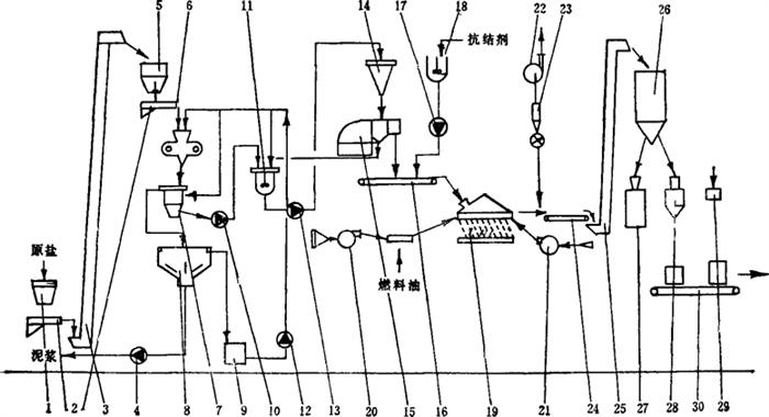 1-供料斗 2-振动筛 3、25-斗式提升机 4、10、13-盐浆泵 5-原盐仓 6-湿式粉碎机 7-Ⅰ级洗涤器 8-泥浆沉清器 9-卤水罐 11-Ⅱ级洗涤器 12-卤水泵 14-调厚器 15-离心机 16、24、30-皮带机 17-计量泵 18-药剂罐 19-流化床干燥器F=5m2 20、21-鼓风机 22-引风机 23-旋风分离器 26-盐仓Q=120t 27-包装机 28-装包机 29-缝包机