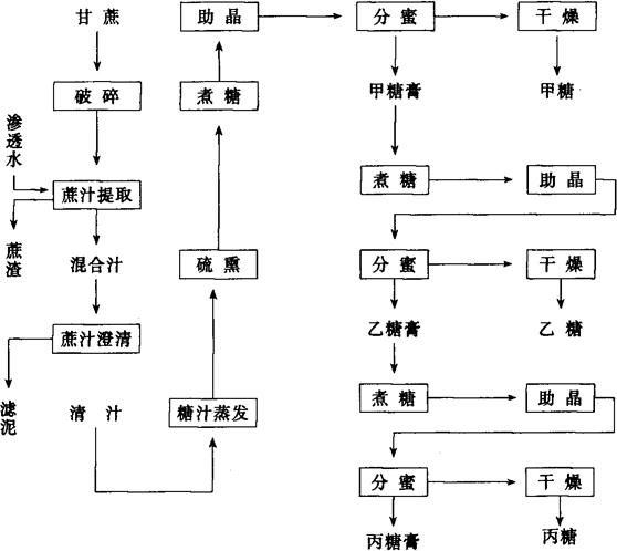 释义 | 甘蔗糖加工装备 1 概述 甘蔗糖生产方法有以下两类:一是按提汁方法分为压榨法、渗出法和磨压法,其中压榨法和渗出法是现行普遍采用的方法;二是按糖汁清净(澄清)工艺分类为石灰法、亚硫酸法和碳酸法,我国大多数甘蔗糖厂采用亚硫酸法,也有一些厂采用碳酸法,而石灰法仅用于粗糖生产。不同生产规模的甘蔗糖厂应选择不同的生产方法(表1-7-5)。 表1-7-5 甘蔗糖生产方法的选择 在采用压榨法制糖过程中,压榨机是糖厂增加生产能力的关键设备。近年来,甘蔗糖加工业广泛采用节能和自控技术,对提高生产效率、蔗糖质量和降低生产成本等方面发挥了积极作用。 2 加工工艺 甘蔗糖加工工艺流程见图1-7-23。 图1-7-23 甘蔗糖加工工艺流程 2.1 破碎 破碎是甘蔗糖生产的关键工序,它对蔗糖提取率有很大影响。其中压榨法采用切蔗机把甘蔗切碎,破碎度一般为60%~80%;渗出法采用撕裂机把甘蔗撕碎,破碎度一般为80%~90%;磨压法采用磨碎机把甘蔗磨碎,破碎度一般为85%左右。 2.2 蔗汁提取 2.2.1 压榨法 斩切到适应破碎度的甘蔗经3~6台压榨机进行榨汁,并在各台压榨机之间加入适量的稀蔗汁和热水,利用反复渗透法提取甘蔗中的糖分。渗透水的加入量一般控制在20%~30%(对甘蔗重量)为宜,水温为40~45℃,渗透水喷射压力为0.06~0.1MPa,加水点应接近压榨机出口,争取较长的渗透时间。一般将第1台压榨机压出的原汁和第2台压榨机压出的稀汁混合后成为压榨工段的成品,经过滤后送下道澄清工序,而以后几台压榨机压出的稀汁返回到前2台压榨机作为稀释水。排出的蔗渣含水分约45%~50%。 2.2.2 渗出法 渗出法分蔗丝渗出法和蔗渣渗出法两种,其中蔗丝渗出法是把撕碎的蔗料直接送入渗出器中,同时加入渗出水并与蔗丝相对逆流运动,渗出水加入量一般为25%~30%。蔗料温度分为3个区间(由进水温度控制),预热区的蔗料由20~25℃提高到60~70℃;热裂区达到85~90℃;渗出区达到50~60℃。渗出时间为20min左右。提取糖分后,废蔗丝送入脱水机脱水,脱水汁澄清后送回渗出器作渗出水使用的稀汁。蔗渣含水分为50%以下。蔗渣渗出法是把破碎后的蔗丝先送入压榨机,榨出60%~70%的原汁,蔗渣再送入渗出器取出糖分,最后再送入压榨机脱水。渗出用水量为20%~25%(对甘蔗)。 2.2.3 磨压法 磨压法是近年来在压榨法和渗出法基础上发展起来的。采用磨-渗-压和磨-压-渗-压等流程提取蔗丝中的糖分,该法属逆流多级复式渗淋及多重轻挤相结合。其渗出用水量为23%~30%。加热到90~95℃后进行喷淋,使蔗丝降到55~72℃。蔗渣脱水后含水量为48%~52%。 蔗汁提取所需装备为压榨机、渗出器、磨碎机、蔗渣压干机和中间渗压机等。 2.3 蔗汁澄清 提取的蔗汁为暗绿色混浊液体,应经过加热、加澄清剂沉淀、沉降和过滤等工序,除去蔗汁中的非糖杂质,使其成为清净的透明蔗汁。 2.3.1 石灰法 石灰法是单以石灰作澄清剂对蔗汁进行澄清的方法。采用加灰和加热交替作用,使非糖分进行沉淀后分离。其工作参数为:加灰量为每处理1t甘蔗用石灰0.5~0.8kg,石灰乳浓度为15~5°Bé,石灰质量为CaO含量85%以上,加灰后蔗汁pH为7.4~8.8,经充分搅拌后进行加热,加热温度为100~105℃。总的来说,该法对蔗汁非糖分的除去有一定的效果,如蛋白质、氧化镁、硅酸、淀粉和蜡等大部分被除去,草酸、磷酸和果胶等也大部分沉淀。 该法是制造粗糖时简单易行方法。 2.3.2 亚硫酸法 亚硫酸法是在蔗汁中加入石灰和二氧化硫进行澄清蔗汁的。按澄清剂加入次序分为先硫后灰、先灰后硫和灰硫齐加三种方式。其中先硫后灰是蔗汁经预灰(pH6.0~7.0)后,进行第一次加热(60~70℃),接着硫熏(加SO20.7~1g/L),再加灰中和(pH7.2~7.5),第二次加热(100~102℃)后,经沉降分离得到清汁;先灰后硫是蔗汁经第一次加热(50~55℃)后,先加灰(pH8.5~9.0)呈碱性,然后再硫熏中和(pH7.0±0.2),第二次加热(100~102℃)后,经沉降分离得到清汁;灰硫齐加是蔗汁经预灰(pH6.6~6.8)和第一次加热(55~70℃),再同时加入石灰乳和二氧化硫,使pH为7.0~7.2,第二次加热(100~102℃)后,经沉降分离得到清汁。 亚硫酸法澄清蔗汁的非糖分具有良好的效果,主要用于生产白糖。 2.3.3 碳酸法 碳酸法是在蔗汁中加入大量石灰,并通过二氧化碳气,生成结构紧密而易于过滤的碳酸钙沉淀,使蔗汁中的非糖分析出。为了获得较好的澄清效果,现在基本都采用双碳酸法澄清工艺。其流程是先将蔗汁加热至45~50℃后,进行预加灰(预灰时间为5~10min,pH为10.5~11,石灰量为总石灰量的10%)。然后同时加入石灰乳和通入CO2,其中加灰量为甘蔗重量的1.5%~2%(即占总石灰量的90%),pH为10.5~11,最终碱度为0.04%~0.08%,加热温度控制在55℃左右,这时的蔗汁称为一碳饱充汁(简称一碳汁),加热后(70~75℃)用压滤机、沉降器及吸滤机分离沉淀物。在滤汁中再加入CO2,使温度保持在70~75℃,持续5~10min后,最终pH为8.2~8.6,这时的蔗汁为二碳饱充汁(或二碳汁)。再行加热过滤,将滤汁硫熏至pH为6.9~7.1,经加热(100~105℃)而得到澄清汁。 碳酸法是生产较高质量白糖和澄清效果较好的一种澄清处理方法。 蔗汁澄清所需装备为预灰设备、硫熏器和饱充罐等,还另配置沉降器和过滤器等通用设备。 2.4 糖汁蒸发 经澄清后的糖汁浓度一般为12~16°Bx,必须蒸发浓缩成浓度为55~65°Bx的浓糖浆,才能煮糖。目前,各甘蔗糖厂多采用五效真空蒸发方案,蒸汽压力为0.2MPa(表压)以上,这种方案第一效至第二效处于加压状