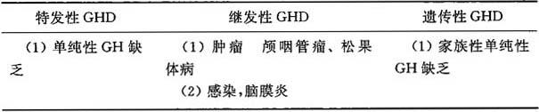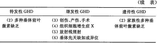 | 释义 | 生长激素缺乏症 【释义】: 生长激素缺乏(GHD)是由于垂体前叶分泌的生长激素(GH)不足而造成的生长缓慢及身材矮小者,又称垂体性侏儒症。本病在儿童中的发生率报道不一,约为1/8000~1/4000。通常可分为特发性、继发性及遗传性三大类。 1.特发性生长激素缺乏症 引起GH缺乏的部位可在下丘脑或垂体,病因及发病机制不完全清楚。可以是单独GH缺乏,也可同时存在其他垂体前叶激素如TSH、ACTH等分泌不足。患儿有娩出史异常,如臀位、足位、横位出生者占70%,有窒息者占62%,有的病例在围产期就表现有脑功能障碍症状,说明本病与神经系统损伤有重要关系。曾发现垂体小,前叶萎缩,嗜酸细胞减少,有囊肿形成和结缔组织增生等病变。推测可能是分娩脑损伤的后遗症。 2.继发性生长激素缺乏症 由于垂体或下丘脑存在器质性病变,可出现GH分泌缺乏,比较多见的是肿瘤,如颅咽管瘤、松果体瘤、垂体腺瘤等,也有由于头部外伤及手术引起,或头部受X线照射,还可继发于先天性中枢神经系统的畸形,如垂体缺如,面中裂畸形等。 3.遗传性生长激素缺乏症 多为常染色体隐性遗传(Ⅰ型),另为常染色体显性遗传(Ⅱ型)或性连锁显性遗传。有报道遗传性GHD患者垂体发育不良、很小。见表13-1。 表13-1 GHD的病因分类表