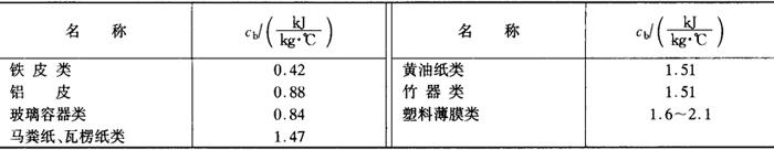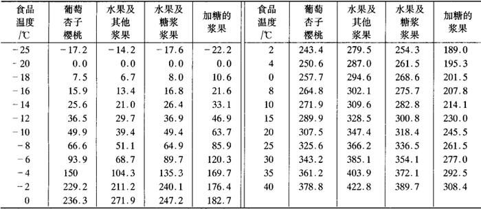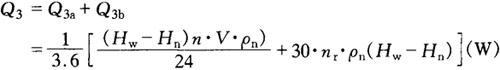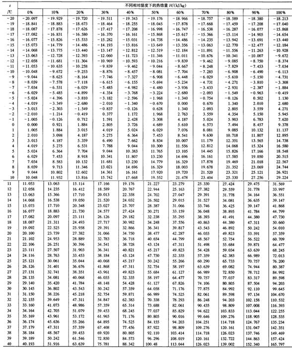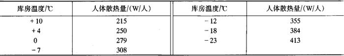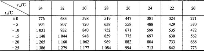注:鲜水果、鲜蔬菜在降温和贮藏过程中有呼吸热需要计算Q2。、Q2d。 ③库房内通风、换气的耗冷量Q3 式中 Q3a——货物的通风换气耗冷量,W Q3b——操作人员的通风换气耗冷量,W n——每昼夜更换新鲜空气的次数,一般可采用2~3次 V——该库房的内净容积,m3 ρn——该库房的空气密度,kg/m3,见表6-7-63 表6-7-63 干空气在压力为101.325kPa时对传热有影响的物理参数 Hw,Hn—-库外、库内空气的热焓值,kJ/kg,见表6-7-64 表6-7-64 空气的热焓量H(-20~40℃,101.325kPa) 24——每昼夜该库更换新鲜空气的通风运转时间,h 30——每小时需供给每个操作工人的新鲜空气量,m3/h n——在该库操作工人的人数
