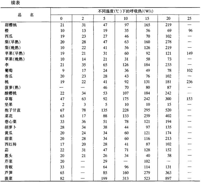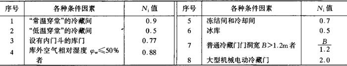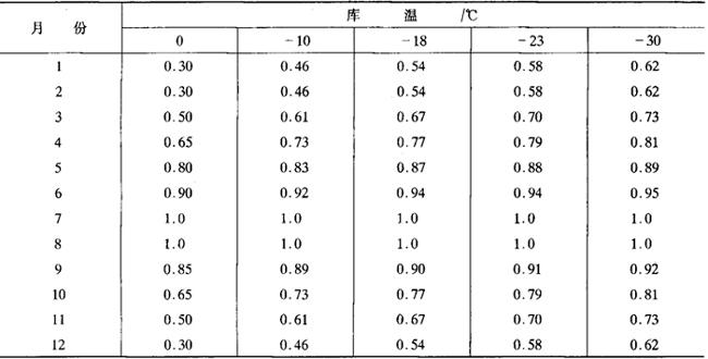 释义 | 用冷参数及冷负荷计算 1.室外计算参数的确定 (1)室外计算温度 计算夏季通过冷藏库围护结构的传入热量时,一般可按《工业企业采暖通风和空气调节设计规范》(GBJ19),选用近10年中平均每年不保证5d的日平均干球温度作为夏季室外计算温度。 (2)室外计算相对湿度 可按《工业企业采暖通风和空气调节设计规范》中规定的最热月平均相对湿度。 2.冷藏库耗冷量的计算 冷藏库耗冷量的计算,其目的在于正确合理地确定各库房的冷分配设备负荷及制冷机负荷。冷库的耗冷量在一年四季中并不是恒定不变的,其大小受到室外气温、冷冻或冷却货物的进货量以及操作管理方式等等因素的影响。因此,在一般情况下,先计算各种耗冷量的最大值,然后在确定库房冷分配设备负荷及制冷机负荷时,再根据不同情况对某些耗冷量乘以不同的修正系数。 (1)冷库库房冷分配设备总冷量负荷Q QK=Q1+PQ2+Q3+Q4(W) 式中 Q1——围护结构传热而引起的耗冷量,是通过围护结构所传导的热量,W Q2——食品含热的耗冷量,即冷却、冻结、再冻结和贮存食品时其本身在冷加工过程中的耗冷量,W Q3——库房内通风、换气耗冷量,为库房在贮存某些食品进行新鲜空气更换时及生产车间进行空气调节时由新鲜空气带入热量而引起的耗冷量,W Q4——操作管理的耗冷量,指在库房内的电动机、照明用灯发出的热能和库门开启、操作工人、操作设备产生的热量而引起的耗冷量,W P——冷却或冷冻加工的负荷系数,此系数考虑到食品初期冷冻时热负荷较大的因素,一般冷却或冻结时取P=1.3,其他冷藏间取P=1 ①围护结构传热而引起的耗冷量Q1 Q1=qa·A(W) 式中 Q1——通过墙面、中间层的楼地板及屋顶的热负荷,W qa——围护结构的单位传热量,W/m2,一般取12~14W/m2 A——围护结构的传热面积,m2 ②食品冷冻加工和贮存时的耗冷量,Q2 式中 Q2a——食品热量,W Q2b——包装材料和运载工具热量,W Q2。——食品冷却时的呼吸热,W Q2d——食品冷藏时呼吸热,W G′——冷间每日进货量,kg H1——食品进入冷间初始温度时的热焓值,kJ/kg,见表6-7-59 表6-7-59 食品的热焓值表 单位:kJ/kg H2——食品在冷间内终止降温时的热焓值,kJ/kg,见表6-7-59 T——货物冷却时间,h,对冷藏间取24h,对冷却间、冻结间取设计加工时间 B——货物包装材料重量系数,见表6-7-60 表6-7-60 货物包装材料重量系数表 t1,t2——食品入库、出库时包装材料的温度,℃ Cb——包装材料和运载工具的比热容,kJ/(kg·℃),见表6-7-61 表6-7-61 包装材料或运载工具的比热容表 q1——货物冷却初始温度时的呼吸热量,kJ/kg,见表6-7-62 表6-7-62 一些主要水果与蔬菜的呼吸热 注:表中抱子甘蓝又称嫩芽卷心菜,青豆又称四季豆。 q2——货物冷却终止温度时的呼吸热量,kJ/kg,见表6-7-62 Gn——冷藏间冷藏量,kg