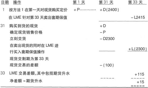 提前一个月定价,并且在期货升水的市场中进行卖出套期保值。在货物到达卸货港时卖出现货金属并且将对先前的空头期货头寸买入平仓以结束套期保值。