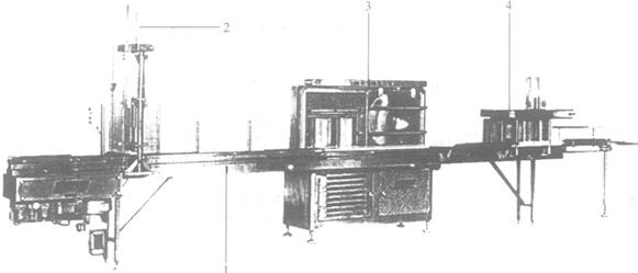 释义 | 用途和种类 火腿成型设备用于将腌制加工处理后的肉类在模具内灌注成型,并用透明塑料袋包装,使火腿具有收缩性能,防止蒸煮时表面丧失水分、确保火腿外形坚固、确保能较长时间的贮存,获得外观极佳的制品。 塑料袋包装的成型火腿设备由模具真空填肉机、自动秤与校正机、塑料袋翻提机、带式输送机、真空封口机、加盖器、出模装置组成的一条联合生产机组。部分装置如图3-5-24所示。 图3-5-24 火腿成型过程中的部分设备 1-输送机 2-塑料袋翻提机 3-真空封口机 4-加盖装置 |