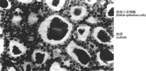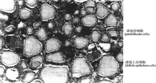 释义 | 甲状腺的形态结构 甲状腺(thyroid gland)位于颈前部,气管上段的前面及两侧。分为左右两叶,相连两叶间有较窄的甲状腺组织,称为峡部(isthmus)。甲状腺外包薄层结缔组织被膜,结缔组织伸入腺体,将其分成许多形状不规则的小叶,每个小叶含20~40个大小不等的滤泡和许多滤泡旁细胞(图15-9),滤泡之间结缔组织内含丰富的毛细血管。成人甲状腺平均重量为20~40g。 滤泡(follicle)为甲状腺的结构与功能单位,大小不一,呈球形或卵圆形。其形状和大小可因性别、年龄、营养状态及食物中的含碘量等而变化。滤泡由单层腺上皮 图15-9 甲状腺(400×) 细胞围成,称为滤泡上皮(follicular epithelium)。滤泡腔内充满胶状物,称为胶质(colloid),它是滤泡细胞分泌物在腔内的贮存形式,主要是甲状腺球蛋白(thyroglobulin)。滤泡上皮细胞多呈立方形,核圆居中,电镜下,滤泡上皮细胞游离面见微绒毛,胞质内含较发达的粗面内质网和高尔基复合体,溶酶体散在于胞质内。细胞顶部胞质内含电子密度中等、体积较小的分泌颗粒和从滤泡腔摄入的低电子密度的胞质小泡。滤泡上皮细胞的形状可随功能状态而变化,当分泌功能旺盛时,细胞呈柱状,滤泡腔内胶质减少,胶质较稀薄;功能减退时,细胞变为扁平,胶质增多而较黏稠。滤泡上皮细胞具有合成、贮存、碘化、重吸收、分解和释放甲状腺激素(thyroid hormone)的功能。 滤泡旁细胞(parafollicular cell)又称降钙素细胞(calcitonin cell),简称C细胞(图15-10)。数量少,单个位于滤泡上皮细胞之间或成群地散布于滤泡之间结缔组织中,在滤泡壁内的滤泡旁细胞顶端被邻近滤泡上皮细胞所覆盖,以致不与滤泡腔内胶状物相接触。HE染色标本,细胞呈卵圆形,细胞大而染色浅,又称亮细胞(1ight cell)。滤泡旁细胞合成和分泌降钙素(calcitonin)。 图15-10 甲状腺示滤泡旁细胞(400×) |