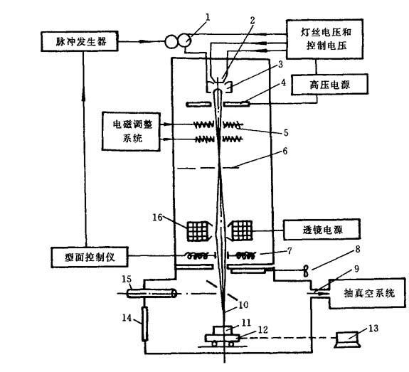 释义 | 电子束加工装置 一般电子束加工装置包括4个部分:电子枪、真空室及抽真空系统、电子束控制系统、工作台系统.见图9-6. 图9-6 电子束加工装置示意图 1—脉冲变换;2—发射阴极;3—控制栅极;4—阳极光阑;5—调整绕组;6—光阑;7—偏转绕组;8—更换工件用截止阀;9—排气;10—电子束;11—工件;12—移动工作台;13—伺服电机;14—工件更换盖及观察窗;15—观察镜;16—聚焦装置(电磁透镜) 9.2.2.1 电子枪系统 如图9-7所示,电子枪是用来发射高速电子流,完成电子的预聚焦和强度控制的装置.其工作过程是:加热的发射阴极3发射出电子束,电子束在阳极光阑较阴极为正的高电压下加速,当速度达2/3光速时通过阳极.加到控制栅极4上的是较阴极为负的偏压,可以控制电子束的强弱,还可对电子束进行初步聚焦.阴极一般用纯钨或纯钽制成,在工作时损耗大,每10~30h更换1次,加热时温度达数千摄氏度. 图9-7 电子枪 1—偏压电阻;2—加热电源;3—发射阴极;4—控制栅极;5—阳极光阑;6—电子束 9.2.2.2 抽真空系统 抽真空的目的是: (1)保证电子高速运动,即避免电子与气体分子碰撞,影响电子高速运动.真空度一般要求1.3×10-2~1.3×10-4Pa. (2)消除电子束加工过程中,由于金属蒸气的影响而使电子发射不稳定. (3)减小加工表面的污染. 抽真空系统如图9-8所示.抽真空系统一般由机械旋转泵(初级)和油(或水银)扩散泵两级组成.机械泵先把真空抽至1.3~0.13Pa的真空度,然后再由油(或水银)扩散泵抽至1.3×10-2~1.3×10-4Pa的高真空度.扩散泵的工作原理是靠加热泵中的油(或水银)所产生的蒸气高速喷出,将真空室中残余气体从泵进口吸入,然后从排气口排出.泵体外冷却水是使油(或)水银蒸气凝成液体聚落于泵体下部,而不致随被抽的气体带走,以备循环使用. 图9-8 抽真空系统 9.2.2.3 电子束控制系统 电子束控制系统包括:束流强度控制、束流聚焦控制、束流位置控制. 束流强度控制:通过加在阴极上的负高压(50~150kV)来实现. 束流聚焦控制:通过“电磁透镜”的磁场作用来实现. 束流位置控制:通过磁偏转控制电子束焦点位置来实现.即通过一定程序改变偏转电压或电流,使电子束按某种规律运动. 9.2.2.4 工作台系统 电子束的偏转(或移动),只能在数毫米范围之内,移动过大则降低加工精度,故需工作台移动与之配合. |