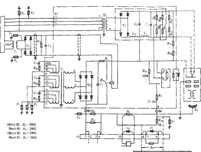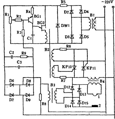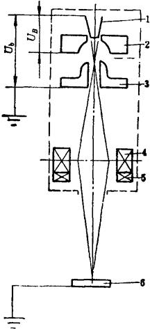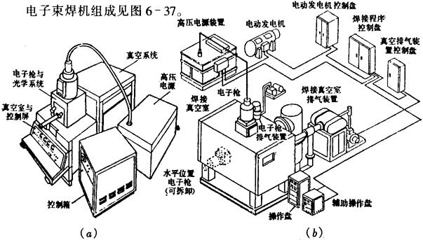释义 | 电子束焊机 1.电子束焊机的组成 电子束焊机组成见图6-37。 图6-37 电子束焊机的组成简图 (a)150kW、40mA标准机型 (b)大功率机型(可焊250mm碳钢) 2.国产电子束焊机型号及技术数据 表6-17 国产电子束焊机型号及技术数据 3.电子束焊机的高压电源电路 高压电源是电子束焊机的关键部件,电路如图6-38所示。T1升压,V1整流获加速电压,T3变压,V3整流供阴极灯丝电压。当加速电压高达200kV时,电焊机升压。主变压器设计,参考电子加速器的设计方案。利用分段变压器,逐级升压,使加速电压逐级升到200kV。分段变压器的磁导体结构如图6-39所示。逐级升压的整流电路接线如图6-40所示。初级△形接法,次级分成6组,电压为30kV、20kV,整流器输出电压高达200kV。要求硅管的反向击穿电压为10kV,整流电流为50mA。三相桥式回路流经每个硅管的电流约41mA。整个高压变压器与整流器置于(6~7)×10-1MPa压力下,充CO2气体的绝缘空间中,由等位环使电压均匀分布。 图6-38 电子束焊机高压电源电路图 图6-39 分段变压器磁导体结构 图6-40 分段串联高压整流电路的接线方式 4.电子束流稳定电路 为使电子束流在电源电压波动时,能够稳定工作,采用了图6-41所示的电路。这种电子轰击预热阴极的电子枪电路,可以保证电源电压波动±15%时,轰击电流波动±0.5%,电子束流波动在10~100μA之间,反应时间小于0.1s。 图6-41 电子轰击预热阴极电子枪电路 稳定电子束流的工作原理:当电源电压降低时,由D6~D9整流器输出电压降低,使BG1的Iec增加,使BG2导通提前,使KP10,KP11的导通角加大,使灯丝1中的电流增加,使灯丝发射电子能力稳定,保证了灯丝1和阴极2之间的轰击电流维持稳定。反之电源电压提高时,KP1。,KP11的导通角相应减小,使灯丝1的加热电流维持不变,使灯丝发射电子能力维持不变,轰击电流仍维持不变。这就自动补偿了电源电压波动对电子束流的影响,使焊接功率不致因电源电压波动引起明显变化。 5.电子束焊枪 电子束焊枪是产生电子束的关键部件。按结构不同分为二极枪和三极枪两类。图6-22中的电子束产生部分,就是二极枪的示意结构图。它由阴极10、聚束极9和阳极8组成,聚束极与阴极等电位。在一定的加速电压下,通过调节阴极温度、改变阴极发射电子流数值,控制电子束流的大小。三极枪的结构如图6-42所示。由阴极1、偏压极2、阳极3组成电极系统。阳极和阴极之间的电位差即加速电压Ub。偏压极相对于阴极呈负电位。改变偏压极的位置、形状及负电位的大小,可以控制电子束流的大小和形状。 图6-42 三极电子枪结构示意图 1-阴极 2-偏压电极 3-阳极 4-聚焦线圈(电磁透镜) 5-偏转线圈 6-工件 Ub-加速电压 UB-偏压 阴极在高温下发射电子,按加热方式不同分为直热式和间接加热式两种。直热式阴极直接通电加热,加热电流的类型和大小是影响阴极寿命和电子束参数稳定的重要因素。在大多数情况下加热电流采用脉动系数小于3%的直流。加热电流应选在接近饱和区的数值,即加热电流增加,发射的束流增加速度明显减慢处的数值。间接加热式的特点是在阴极和加热灯丝之间有数千伏的电压,灯丝受热发射的电子加速撞击阴极,使阴极升温,产生热发射。这种电极的热惯性大,寿命长,形状稳定,电子束流受加热电流影响较小。 阴极的要求:使用热发射能力强且不易“中毒”的材料制造。常用钨、钽制成直热式阴极,用六硼化镧制成间接加热式阴极。阴极形状及其与偏压极之间的相对位置是影响电子束斑点位置、形状、会聚角的重要因素。因此对阴极加工安装应提出严格要求,制造时采用精加工和准确的成形技术。装配精度在0.05~0.15mm范围内。 电磁透镜:电子束流在阳极附近聚集,形成交叉点,穿过阳极孔后逐渐扩散。为使能量集中在焊件上,在电子束通道上设置一聚焦线圈,即电磁透镜。线圈中电流越强,电子束焦交角越小,斑点越小。30kW以上的大功率电子枪为增强聚焦效果,采用两级聚焦,如图6-43所示。 图6-43 双聚焦线圈的电子枪示意图 1-第一聚焦 2-第二聚焦 3-光阑 s-工作距离 α-会聚角 |
