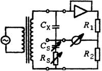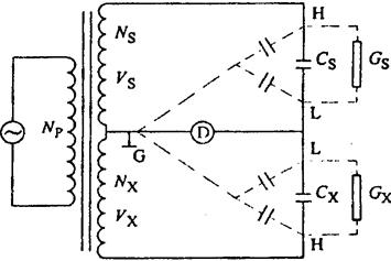 释义 | 电容计量 1.电容器 电容计量的目的是用由计算电容复现的电容单位量值标定待测电容器的电容量。由于计算电容复现的电容量很小,仅有0.5pF,而且操作复杂,为了适应检定工作的需要,设立了由四只标称值为10pF的石英电容器组成的电容单位国家副基准,其数值由计算电容测定,然后再传递到一系列范围宽广的电容量值。实用的范围为0.0001pF~1F,跨越16个数量级。为了保存这么宽范围的电容量值,需要不同种类的标准电容器,如表6.4-1所示。 表6.4-1 不同量限电容量使用的标准电容器 标准电容器的稳定度以石英电容器为最好,可达到10-6/年量级。空气电容器和云母电容器可达到10-5~10-6/年,涤纶电容器及电子等效电容的特点是容量很大,但稳定性只能达到达10-3~10-2/年,除了电容器的稳定性,标准电容器的损角也是一个重要参数,损角越小,表示电容的阻抗越接近理想的容抗,密封电容器的损耗可小到10-6量级,因此也常用作损角标准。石英电容器的损耗可小到10-5量级,云母电容为10-4~10-5,塑料膜电容器为10-3~10-4,变压器等效电容则为10-2~10-3。 近年来由于计算机电源的需要,大容量电容的计量工作的需求较多,有的电容器容量已达1F,这些电容多半是电解电容,但电解电容的准确度不易做高,作为大容量的标准电容,必须想别的办法。变压器等效电容就是为此目的而设计的一种大容量标准电容,其原理如图6.4-1所示,如果变压器的变比为N,则从原边看,接在次级的电容量C的等效电容为N2C,如果N=1000,C=1μF,等效电容就为1F,而1μF的电容是可以用塑料膜电容,体积不很大,而稳定性可达到10-3量级,适合于大容量标准电容的需要。 图6.4-1 变压器等效电容 大容量电容标准的另一问题是其阻抗较低需用四端纽接法,因此在图6.4-1的右侧又接了另一个变压器作为电压互感器,其变比也是N,这样,图6.4-1的变压器等效电容器就成了一个名义值为N2C的四端大容量标准。 2.标准电容的检定方法及测量仪器 电容量值一般都是用交流电桥进行测量。传统的交流电桥是由阻抗元件构成,图6.4-2给出了常用的测量电容量和损耗角的西林电桥。图中,被测臂电容器用等效串联电路表示,标准臂电容器CS按理想元件定义,它通常是高质量的十进电容器并带有一个可微调的可变电容;C1和R1、R2为可调电容和电阻,构成比例臂。电桥平衡时,被测电容Cx及其等效串联电阻值RX和损耗因数DX可由下式求出。 图6.4-2 西林电桥原理电路图 由上述表达式可看出,电桥的平衡方程与频率无关,但损耗因数的表达式与频率有关,因此,电容盘C1应在不同频率下进行过检定,使用在6.4-10式时要加频率修正。 图6.4-2所示的西林电桥,当将其被测臂和C1、R1臂的位置对调,且标准臂和被测臂均为固定电容器时,则成为高压西林电桥。因为此时电桥的调节部分均置于指零仪的另一边,若在标准臂和被测臂的公共接点处的电源端接入较高的电压,由于标准臂和被测臂的电容器的降压作用,可使指零仪和比例臂的调节装置仍处于低电压状态。这种电桥广泛应用于高电压下测量绝缘材料的介质损耗及高压电容器。根据标准电容器和被测元件的不同要求,其电源电压可由100V至高达20kV,工作频率一般在50~100H2范围。 上述这种由阻抗元件构成的交流电桥,测量准确度不超过10-4量级,因此对于一些准确度要求高的测量,一般都采用替代法。替代法测量的准确度主要取决于所用标准器的准确度等级及装置的分辨率。 五十年代开始发展起来的变压器电桥,比传统的交流电桥能更好地满足电容精密测量的要求。这种电桥的原理如图6.4-3所示,电桥的比例臂用感应分压器的两个绕组构成,这两个绕组称为比例绕组,用相互耦合得很紧的绞合线构成,并用高μ合金构成镯环型铁心(见图6.4-4)。这样,比例绕组耦合的基本上是同一公共磁通,产生的感应电势就严格地与比例绕组的匝数成为正比,因此可以达到很高的比例准确度。精心制作的比例绕组其感应电势的比例准确度可达到10-6~10-9。 图6.4-3 变压器电桥的原理线路 图6.4-3的变压器电桥平衡时,可得 Vs(jωCs+Gs)=Vx(jωCX+Gx) (6.4-11) 将上式分成实部和虚部两个等式,整理后得 图6.4-3中电桥的接地点G选择在两比例臂的连接处,这样,标准和被测电容的高端H及低端L对地的电容对上述平衡方程式不产生影响,因为两个H点对G点的电容是并接在变压器的两端,只是增加了副端绕组的负载电流,而并不影响其输出电压VS和VX的值。 图6.4-4 用环形铁芯及绞合线绕组构成的感应分压器 电桥的不平衡量可用灵敏的交流指零仪D指示,采用相检波技术的指零仪,可以检出10-8~10-9量级的不平衡量。另一方面,相检波指零仪可以很好的检出90°分量,即反应电容的相角分量,因此,此种电桥也可用于电容损角测量。 变压器电桥常用的比例为1:1,1:10和1:100。1:1比例用于同名义值电容的比较,1:10和1:100则用于十进电容量值之间的传递。 图6.4-3的变压器电桥主要适合小容量电容器的测量,对于大容量电容器,引线的影响不能忽略,因此需用四端钮测量线路,图6.4-5中就是一例。四端钮接法的CS和CX上的电压经运算放大器匹配后供给电阻分压器,就避免了引线阻抗的影响。由于电阻分压器的分压比可以做得很大,CS可以用1μF左右的标准电容箱,RS则用于平衡损角。 图6.4-5 适合于大电容测量的变压器电桥 上述电桥均为手动接法,运用现代电子技术的成就可以组成自动测量的
