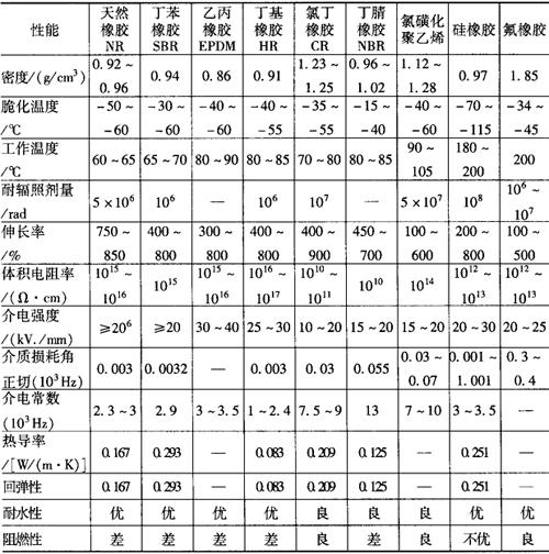 释义 | 电工橡胶 橡胶分天然橡胶和合成橡胶。天然橡胶主要用作天线、电缆绝缘和护层材料及其他橡胶制品等。合成橡胶主要用作船用电缆、控制电缆和电力电缆的绝缘、电机、电器引出线绝缘等。各种橡胶的特性见表13-35。 表13-35 橡胶的性能 |