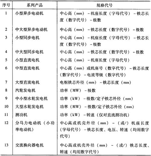 释义 | 电机的系列产品规格代号 电机的规格代号用中心高、铁芯外径、机座号、机壳外径、轴伸直径、凸缘代号、机座长度、铁芯长度、功率、电流等级、转速或极数等来表示。 主要系列产品的规格代号按表2-2的规定。 表2-2 电机系列产品规格代号组成及含义 机座长度采用国际通用字母符号来表示,S表示短机座,M表示中机座,L表示长机座。铁芯长度按由短至长顺序用数字1、2、3……表示。凸缘代号采用国际通用字母符号FF(凸缘上带通孔)或FT(凸缘上带螺孔)连同凸缘固定孔中心基圆直径的数值来表示。 电机的特殊环境代号列于表2-3。 表2-3 电机特殊环境代号 |