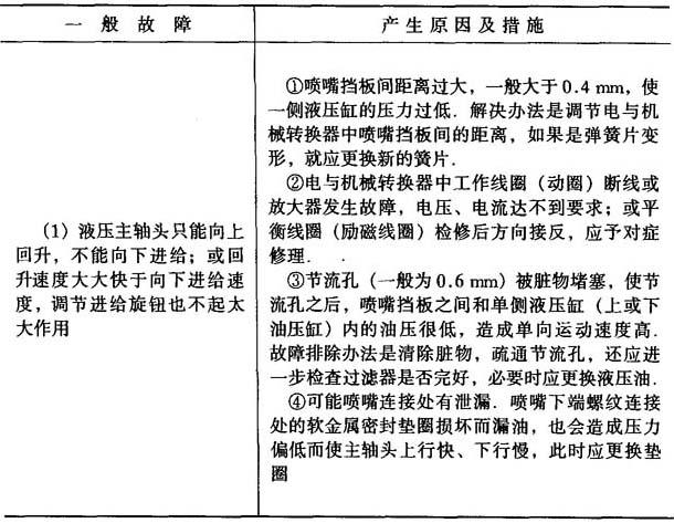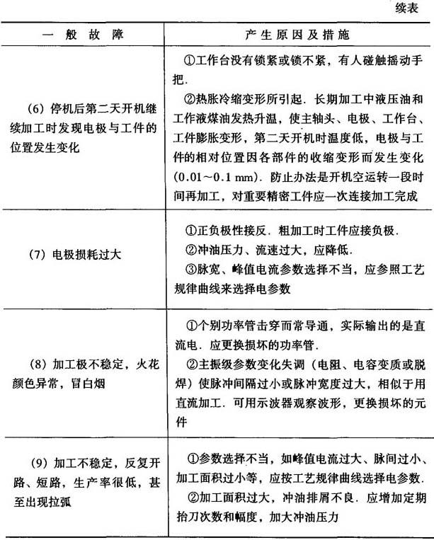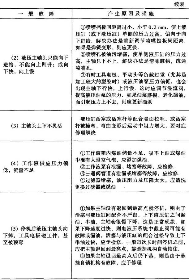 释义 | 电火花加工机床常见故障 电火花加工机床一般故障有机械部分故障、液压部分故障和电气部分故障,并且相互关联,需要认真观测才能发现.常见故障产生原因及措施见表3-18. 表3-18 常见故障产生原因及措施 |