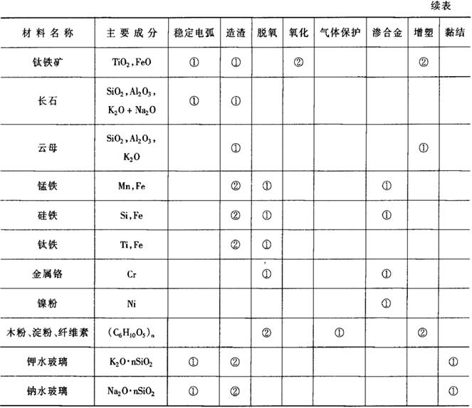 释义 | 电焊条的组成 电焊条由焊芯和涂料药皮两部分组成。各种焊条的药皮都具有一定的厚度,通常用“药皮质量系数”来表示药皮与焊芯的相对质量比,即 药皮质量系数(K)=[(药皮质量)/(相同部分的焊芯质量)]×100%根据药皮的质量系数(K),可把电焊条分为厚药皮焊条(K=30%~50%)和薄药皮焊条(K=1%~2%)。目前在焊接生产中广泛使用的基本上都是厚药皮焊条。 1.焊芯 焊芯是指电焊条用的被药皮包覆的金属芯,例如H08A钢芯。焊芯有两个作用:一是传导电流,产生焊接电弧;二是焊芯本身熔化形成焊缝中的填充金属。焊芯采用焊接专用的金属丝(即焊丝)制造。焊芯牌号的首位字母是“H”,后面的数字表示含碳量,其他合金元素含量的表示方法与钢材的表示方法大致相同。对高质量的焊条焊芯,尾部加“A”表示优质钢,加“E”表示特优质钢。通常各种电焊条所用的焊芯种类如表1-2-4所示。常用焊芯的化学成分列于表1-2-5。 表1-2-4 常用各种电焊条所用的焊芯 表1-2-5 常用焊芯的化学成分[6] 2.药皮 焊条药皮是指均匀包覆在焊芯表面的涂料层。药皮的作用是在焊接过程中形成具有合适的熔点、黏度、密度、碱度等物理化学性能的熔渣,保证电弧稳定燃烧,使熔滴金属容易过渡,在电弧区和熔池周围造成一种气氛,保护焊接区域,获得良好的焊缝成形与性能等。此外还可通过向药皮中加入脱氧剂、渗合金元素或一定含量的铁粉,满足焊缝金属使用性能或提高熔敷效率的要求。 焊条药皮由多种具有不同物理和化学性质的细颗粒物质的混合物组成,可以采用氧化物、碳酸盐、硅酸盐、有机物、氟化物、铁合金等数十种原材料粉末,按照一定的配方混合而成。各种原材料根据其在焊条药皮中的作用,可分成下述几类。 (1)稳弧剂 主要作用是使焊条容易引弧及在焊接过程中保持电弧稳定燃烧。作为稳弧剂的原材料主要是一些含有一定数量低电离电位易电离元素的物质,如长石、水玻璃、金红石、钛白粉、大理石、云母、钛铁矿、还原钛铁矿等。 (2)造渣剂 焊接时能形成具有一定物理化学性能的熔渣,保护焊接熔滴和熔池金属,改善焊缝成形。作为造渣剂的原材料有大理石、萤石、白云石、菱苦土、长石、白泥、云母、石英、金红石、钛白粉、钛铁矿等。 (3)脱氧剂(又称还原剂) 通过焊接过程中的化学冶金反应,降低焊缝金属中的氧含量,提高焊缝金属的性能。脱氧剂主要是含有对氧亲和力大的元素铁合金及其金属粉,常用脱氧剂有锰铁、硅铁、钛铁、铝铁、硅钙合金等。 (4)造气剂 在电弧高温作用下分解出气体,形成保护气氛,保护电弧及熔池金属,防止周围空气中氧和氮的侵入。常用的造气剂有碳酸盐(如大理石、白云石、菱苦土、碳酸钡等)及有机物(如木粉、淀粉、纤维素、树脂等)。 (5)合金剂 用于补偿焊接过程中合金元素的烧损及向焊缝中过渡合金元素,以保证焊缝金属的化学成分及性能。根据需要可选用各种铁合金(如锰铁、硅铁、铬铁、钼铁、钒铁、铌铁、硼铁、稀土硅铁等)或纯金属(如金属锰、金属铬、镍粉、钨粉等)。 (6)增塑剂 主要作用是改善药皮涂料在焊条压涂过程中的塑性、弹性及流动性,提高焊条的压涂质量,使焊条药皮表面光滑而不开裂。通常选用有一定弹性、滑性或吸水后有一定膨胀特性的物料,如云母、白泥、钛白粉、滑石粉、固体水玻璃、纤维素等。 (7)黏结剂 使药皮物料牢固地黏结在焊芯上,并使焊条药皮烘干后具有一定的强度。在焊接冶金过程中不对熔池和焊缝金属产生有害作用。常用黏结剂是水玻璃(钾、钠及其混合水玻璃)及酚醛树脂、树胶等。 药皮中常用原材料的作用列于表1-2-6,每种物料在药皮中可同时起几种作用。 表1-2-6 常用原材料在焊条药皮中的作用[4,5] 注:①主要的作用;②次要的作用。 |