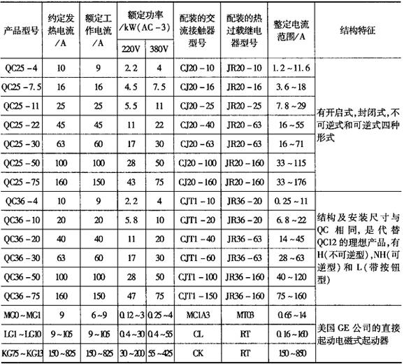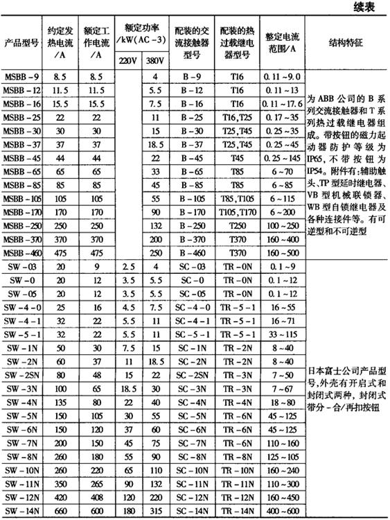 释义 | 电磁起动器 1.适用范围 电磁起动器(又称磁力起动器)主要用于控制交流50Hz(或60Hz)。额定工作电压至660V的三相鼠笼式感应电动机的直接起动、停止和正反运转,并可对电动机进行过载保护和断相保护。 2.电磁起动器的结构特征 电磁起动器一般采用金属外壳防护式结构,也有塑料制成的外壳,内部由交流接触器和热过载继电器组成,由安装卡轨将其固定在壳内。一般有不可逆、不可逆带按钮、可逆等几种结构形式,标准型不可逆启动器有1只接触器和1只热继电器组成。标准型可逆启动器有2只接触器和1只热继电器组成。2只接触器之间装有机械联锁装置。其中带按钮启动器采用接插件连接方式,用户安装和维护非常方便。凡是生产交流接触器和热过载继电器的公司,都会推出电磁式起动器。 3.常用电磁起动器产品型号及主要技术参数 常用电磁起动器产品型号及主要技术参数见表1-113。 表1-113 常用电磁起动器产品型号及主要技术参数 4.常用电磁起动器外形及安装尺寸 常用电磁起动器外形及安装尺寸见图1-82和表1-114。 图1-82 常用电磁起动器外形及安装尺寸 表1-114 常用电磁起动器外形及安装尺寸 |