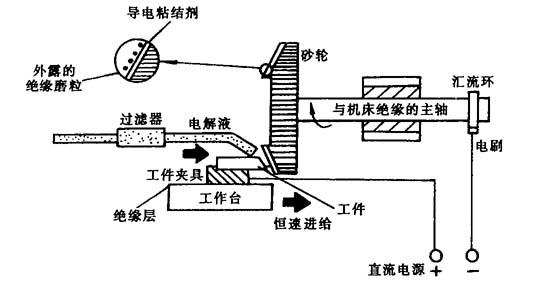 释义 | 电解磨削的基本原理及特点 7.4.1.1 基本原理 电解磨削是电解加工的一种特殊形式,是电解与机械的复合加工法.它是靠金属的溶解(占95%~98%)和机械磨削(占2%~5%)的综合作用来实现加工的.加工原理见图7-29. 图7-29 电解磨削原理图 加工过程中,磨轮(砂轮)不断旋转,磨轮上凸出的砂粒与工件接触,形成磨轮与工件间的电解间隙.电解液不断供给,磨轮在旋转中,将工件表面由电化学反应生成的钝化膜除去,继续进行电化学反应,如此反复不断,直到加工完毕. 电解磨削的阳极溶解机理与普通电解加工阳极溶解机理是相同的.不同之处在于:电解磨削中,阳极钝化膜的去除是靠磨轮的机械加工削除的,电解液腐蚀力较弱;而一般电解加工中的阳极钝化膜的去除,是靠高电流密度去破坏(不断溶解)或靠活性离子(如氯离子)进行活化,再由高速流动的电解液冲刷带走,电解液应含较强活化能力的离子. 7.4.1.2 特点 (1)生产率高且可加工高硬度、高韧性金属.因为电解磨削主要(占95%~98%)是靠电化学作用腐蚀并去除金属. (2)磨削力校磨轮损耗低.因为需磨轮去除的钝化膜硬度低,故磨削力校磨削热也校消耗功率也小.例如用碳化硅砂轮纯机械磨削硬质合金,砂轮损耗为硬质合金的4~6倍,但采用电解磨削时,磨轮损耗仅为硬质合金的50%~100%. (3)加工精度高,表面加工质量提高.因为电解磨削加工,工件的尺寸或形状是靠磨轮刮除钝化膜获得,故能获得比电解加工更高的加工精度.一般加工精度为:0.01mm数量级,表面粗糙度Ra=0.2~0.5μm. (4)存在的主要问题是:设备投资较高.其原因是:①需加辅助设备.如抽风吸雾装置、电解液过滤装置等.②需加设备防腐处理. |