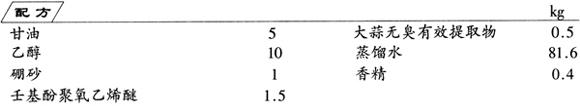将甘油、硼砂溶于水,制成水溶液;将香精、大蒜提取物、壬基酚聚氧乙烯醚溶于乙醇,制成醇溶液。将醇溶液加于水溶液中,进行增溶溶解,过滤、灌装,即为成品。