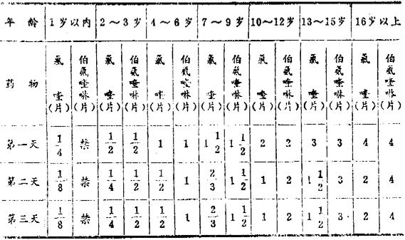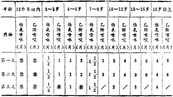 释义 | 疟疾 【感染途径】 疟疾是由感染了疟原虫的蚊子叮咬人时,将疟原虫传染给人体而引起,也可因输入隐性疟疾病人的血液而感染。 【临床表现】 一、间日疟:每隔1日发作1次,先发冷、寒战,后发高热、面红、头痛、全身酸痛,持续1~4小时,全身大汗淋漓,迅速退热。可有贫血、脾脏肿大等。 二、恶性疟疾:每日或隔日发作1次,症状严重,病势凶险,分为脑型、胃肠型、肝炎型及休克虚脱型。 三、婴幼儿疟疾特点:症状往往不典型,仅表现为四肢发凉、面色苍白、口唇发绀,无寒战,发热时常伴呕吐、腹泻等胃肠道症状,贫血发展较快,脾脏迅速增大。 化验:白细胞计数减低,红细胞及血红蛋白减低,血涂片可检查出疟原虫,尤以寒冷时阳性率高。 【诊断】 根据间歇发作、先发冷后发热、出了大汗后退热、贫血、脾脏大及化验检查等,可以诊断。 【预防】 一、开展爱国卫生运动,防蚊、灭蚊,消灭孑孓。 二、彻底治疗病人,重视休止期治疗,杜绝感染源。 三、在疟疾流行区,可预防服药。 预防疟疾服药剂量表 每半月1次,可单用乙胺嘧啶或与伯氨喹啉合用。 【治疗】 一、发作期的治疗: (一)氯喹与伯氨喹啉联合疗法,既能迅速控制发作,又能达到根治目的。氯喹每片0.25克(实含氯喹基质0.15克),伯氨喹啉每片13.2毫克(实含伯氨喹啉基质7.5毫克)。成人第一天服氯喹4片,第二、第三天各服2片,共8片,同时每天服伯氨喹啉4片,连服3天,或每天服伯氨喹啉3片,连服5~8天,以服8天者疗效较好。 治疗疟疾用药剂量表 (二)中药治疗:可用清脾饮,柴胡、黄芩、半夏、厚朴、白术、草果仁、大枣肉各3~6克,水煎,发作前2小时服。每天1剂,连服3剂。若未止,再加常山、乌梅各6~9克,水煎服。 (三)新针疗法:发作前2小时施针(强刺激),取大椎、间使、至阳、曲池穴。 二、休止期根治疗法:在当年11月到次年4月前进行。 疟疾休止期根治服药剂量表 |