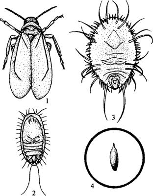 释义 | 白粉虱 【学名】 Trialeurodes vaporariorum Westwood。 【别名】 温室粉虱、通草粉虱。 【分布与为害】 全国各地均有分布。寄主有虞美人、扶郎花、倒挂金钟、瓜叶菊、仙客来、一串红、月季、樱花、桃花、吊钟花、扶桑、茉莉、一品红、桂花、夜来香、马蹄莲、杜鹃、菊花、翠菊、蒲包花、向日葵、大丽花、丁香、紫薇、牵牛花、牡丹、芍药等。成虫和若虫以口器在叶背刺入叶肉吸食汁液,使叶片卷曲,褪绿发黄,甚至干枯。并排出大量蜜露,污染茎叶,引起煤污病,影响生长、开花。 【形态特征】 成虫体长1.0~1.2毫米,翅展2.3毫米。体浅黄或浅绿色,被白蜡粉。复眼赤红色。触角短,丝状。翅膜质,前后翅上各有1条翅脉。卵为椭圆形。初产时黄白色,具柄,后渐变为黑色。 若虫体扁平,椭圆形,黄绿色,体长0.5毫米左右,体周围有白色放射状蜡丝。蛹椭圆形,隆起,浅黄色。蛹壳扁平,长椭圆形,淡黄色,半透明,整个蛹壳背面布满白色絮状蜡丝。 图7-24 白粉虱 1.成虫 2.若虫 3.蛹 4.卵 【生活习性】 在温室内1年可发生10~12代。世代重叠。成虫在上部嫩叶背面吸汁为害。经交尾产卵于叶部。每头雌虫可产卵100~200粒。卵期6~8天。若虫孵化后固定叶背刺吸为害。若虫期8~9天,蛹期6天。此虫可进行孤雌生殖。 【防治方法】 用黄色粘胶板诱杀成虫。喷80%敌敌畏1000倍液,或10%二氯苯醚菊酯2000倍液,杀成虫和若虫。 倒挂金钟除上述病虫害外,尚有白粉病、锈病、普通红蜘蛛、红圆蚧、橘蚜等,可参考其他花卉。 |