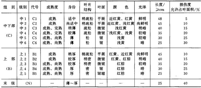 我国白肋烟叶国家标准规定(GB8966-88),白肋烟叶分中下部和上部两个部位,中下部烟叶分1~6个等级,上部烟叶分1~5个等级,另设1个末级,共计12个等级。我国白肋烟叶国家标准,见表4-2-4。