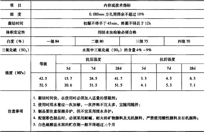 释义 | 白色硫酸盐水泥 1984年,南陵白水泥厂以钾长石、石灰石、白云石为原料,在高炉中熔炼,含钾炉尘从高炉顶部逸出回收后,经浓缩、碳化等工序,得到碳酸氢钾与磷酸二氢钾和熔渣,经烘干、除铁、球磨等工序制得白色硫酸盐水泥,,其强度等级为42.5MPa,白度3~4级。白色硫酸盐水泥具有水泥早期强度好、成型后外表无起砂现象等特点。 我国目前生产的白色硫酸盐水泥的品质、性能和用途,如表13-4所示。 表13-4 国产白色硫酸盐水泥的品质、性能和用途 |