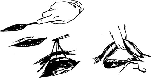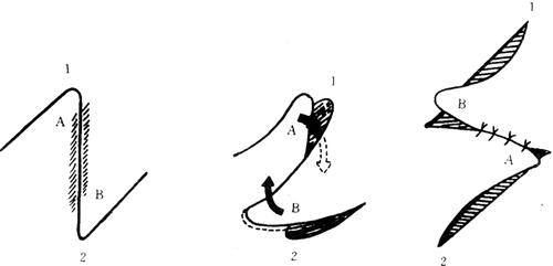 释义 | 皮瓣移植 皮瓣是由皮肤的全层及皮下组织所构成。皮瓣与皮片不同,皮瓣移植必须有与机体皮肤相连的蒂,或行血管吻合,血循环重建后有供给皮瓣的血液和营养,才能保证皮瓣移植成功。与机体皮肤有蒂相连的,称带蒂皮瓣移植或管状皮瓣移植;行血管吻合的,称游离皮瓣移植。 【皮瓣的分类和特点】 1.带蒂皮瓣 (1)皮肤皮瓣。该类皮瓣是在缺损邻近设计皮瓣,没有知名动脉供血,故设计皮瓣时,其长宽比例要受到一定限制。一般来讲,在面部长宽之比以2∶1~3∶1为宜,肢体及躯干部位以1.5∶1为最安全。常用的皮肤皮瓣有对偶三角交叉皮瓣(“Z”字成形术)、滑行皮瓣(如“V-Y”成形术)、旋转皮瓣等(图12-7、图128、图12-9)。 图12-7 “Z”字成形术 图12-8 “V-Y”成形术 a.“Y”形切开,“V”形缝合 b.“V”形切开.“Y”形缝合 图12-9 旋转皮瓣应用 (2)动脉皮瓣。该皮瓣的特点是有一条知名血管供血.因此只要沿血管长轴设计皮瓣,一般可不受长宽比例的限制。 ①岛状皮瓣。皮瓣内含有一对知名动、静脉。该皮瓣血运丰富,生存力强,蒂长,不受长宽比例限制,可旋转至180°。如用颞浅动、静脉形成的头皮岛状皮瓣修复眉部缺损等。 ②隧道皮瓣。隧道皮瓣指形成的皮瓣需通过皮下或深部组织内进行转移。它要求皮瓣内含有知名血管,蒂部的横径与皮瓣的横径相一致,通过隧道的蒂部去除表皮。如用额部隧道皮瓣通过皮下隧道修复面颊部缺损等。 2.游离皮瓣 (1)直接皮肤血管皮瓣。营养皮肤的动脉在穿出深筋膜后与皮肤表面平行,走行于皮下组织内,并沿途发出分支以供养皮下组织与皮肤。临床上常见的皮瓣如腹股沟皮瓣、胸三角皮瓣属于该类。 (2)肌皮血管皮瓣。即肌皮瓣,血管通过肌肉发出营养支,垂直穿出深筋膜至皮下组织及皮肤。该皮瓣在制取时不能将皮瓣与深面肌肉分离,否则不能成活。如临床上多用的胸大肌皮瓣、背阔肌皮瓣属于此类。 (3)肌间隔血管皮瓣。动脉行走于肌间隔内,然后发出分支至皮肤。上臂内、外侧皮瓣属于这种类型。 (4)动脉干网状血管皮瓣。由动脉干上直接发出许多细小的血管支,组成丰富的网状结构,直接营养所属的皮肤。这类皮瓣口径粗,易于吻合成功。足背皮瓣、前臂皮瓣均属于这种类型。 3.管状皮瓣 管状皮瓣,又称皮管。它实际上是一个双蒂皮瓣,是一种卷起来的完全封闭无创面的远位皮瓣。皮管的优点有:组织柔软,收缩性小,色泽好,血运丰富,易于成活,创面闭合,大大减少感染机会,并可借手腕的携带转移到体表的任何部位。缺点是治疗时间长,手术次数多。因此,能采用带蒂皮瓣或游离皮瓣移植时,最好不要选择皮管移植。 【皮瓣移植的适应症】 皮瓣具有大量的皮下脂肪组织,因此,它不仅能整复表浅创面或缺损,还可广泛用来整复较深层或洞穿性缺损。 (1)封闭或覆盖肌腱、肌肉、骨、神经、大血管等暴露的创面。 (2)某些器官的整复再造,如鼻、唇、颊、耳、阴茎等缺损。 (3)用于洞穿性缺损的修复,如面颊部、腭部的洞穿性缺损。 (4)矫治颈部瘢痕挛缩。 (5)还可用来治疗经久不愈的慢性溃疡、放射性溃疡、褥疮等。 【皮瓣的设计原则】 如前所述,皮肤皮瓣的长宽之比有一定限制,四肢和躯干长宽之比为1.5∶1,头面部由于血供丰富,长宽比例可达2∶1~3∶1。皮管的长度不要超过20cm,宽度不要小于6cm,即长宽之比不要超过3∶1。皮瓣或皮管均应按血管走向设计。取皮瓣的深度一般达深筋膜浅面。选择三种类型皮瓣时,原则上宁简勿繁,能用带蒂皮瓣修复的,不用游离皮瓣;能用游离皮瓣解决的,最好不要选用管状皮瓣。 【管状皮瓣的制取方法】 (1)按设计方法,用美蓝画好两条平行线。 (2)沿画线切开,先切开皮肤全层,等皮层收缩后,再切皮下组织,也可在切皮下组织时,刀刃斜向皮瓣,使皮层略宽于皮下组织层,这样可避免脂肪组织夹在切口之皮层间,影响愈合。 (3)在筋膜层进行分离后,将平行切口所形成的双蒂皮瓣的边缘相对缝合,使之形成皮管。注意皮管缝合时,皮下组织可不缝合,单纯缝合皮层即可。一般离创缘3mm进针,每针间距3mm。 (4)缝合供区的创面(图12-10)。 图12-10 皮管的制取方法 【皮瓣移植的注意事项】 1.带蒂皮瓣 (1)皮瓣设计时,应用美蓝在皮肤上按需要画出外形,一般应比缺损处稍大,以免皮瓣转移后发生收缩。 (2)切取皮瓣时,应按所需厚度在同一水平切取,不可高低不平;操作要轻柔,要无创操作,避免损伤重要神经。 (3)皮瓣缝合前要严密止血,以免形成血肿;缝合后局部适当加压包扎,但不能压迫皮瓣蒂部。 (4)皮瓣转移后,供区创面要关闭,可直接拉拢缝合或植中厚皮片。 (5)需断蒂者,应在术后3周进行。 2.游离皮瓣 (1)行游离皮瓣移植时,毫无例外地均应行小血管吻合术,因此术者一定要掌握和通晓显微血管外科的知识和技术,才能保证手术成功。 (2)选择供区时,要考虑色泽、质地、厚度与受区相似,还要避免引起供区的继发畸形和功能障碍。 (3)供区的血管口径应与受区的血管口径尽可能相近。 (4)尽量缩短皮瓣缺血时间,一般应在受区条件准备好后断蒂,吻合要一次成功。 (5)应有足够长的血管蒂,一般在5cm以上,以保证吻合后无张力。 3.管状皮瓣 (1)皮管的血运在蒂部,所以在浸润麻醉时不要在蒂部和皮瓣的皮肤上刺针,以免手术失败。 (2)皮管断蒂前,应先测试皮管血运情况。测试方法:可在蒂部加压,用橡皮筋或止血钳的后端