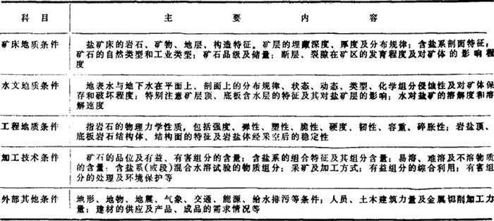 释义 | 盐矿开采技术条件 开采技术条件是评价岩盐或地下卤水矿床开采利用技术可能性和经济合理性的前提条件,是指导制定矿区长远规划和开发计划(包括建设地区的选择、规模等)的主要依据;是选择确定矿区开采工艺、寻求切合实际生产参数的客观资料。 开采技术条件主要包括:矿床地质、水文地质、工程地质、加工技术条件以及地形、地物、气象、地震、交通、能源、劳动力等条件。主要内容详见表3-3-17。 表3-3-17 开采技术条件表 |