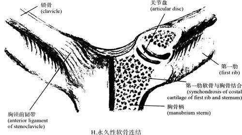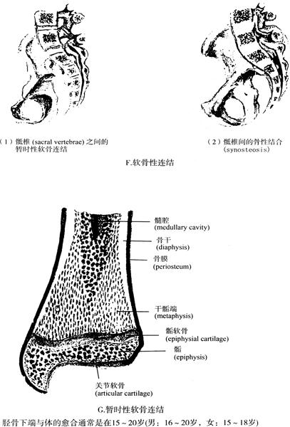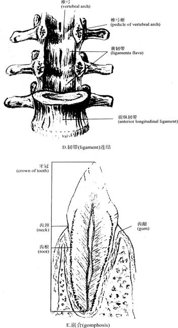 释义 | 直接连结 直接连结(图3-4A~H)的形态特点是:两骨之间无腔隙,无活动或仅有轻微的活动。它有纤维性连结(fibrous joint)和韧带结合(syndesmosis)。纤维性连结有缝(suture),主要见于颅。新生儿颅缝间有少量结缔组织相连即缝韧带(suturel ligament)(图3-4A);随着年龄增长,缝韧带先后骨化,成为骨性结合。依缝的形状有鳞状缝(squamous suture),如顶颞缝(parietotemporae suture)(图3-4B);平缝(plane suture),如腭中缝(median palatine suture)(图3-4C);锯齿缝(seratted suture),如矢状缝(sagittal suture)(图3-4B)。韧带结合(syndesmosis)为两骨之间借纤维结缔组织连结,较坚厚,有一定坚韧性,如黄韧带(ligamenta flava)等(图3-4D)。嵌合(gomphosis)或称钉植或钉状关节,如齿根与齿槽的结合(图3-4E)。软骨性结合(synchondrosis)有两种情况:一为暂时的软骨结合,仅存在于少年时期,骨化后为骨性结合,如骶椎之间的软骨、骺软骨等(图3-4FG);二为永久性软骨结合,两骨之间的软骨终生不骨化,如第一肋和胸骨之间的结合(图3-4H)。 图3-4 直接骨连结(D、E) 图3-4 直接骨连结(F、G) 图3-4 直接骨连结(H) |