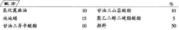 按配比将油、蜡和酯混合,加热熔化。加入颜料,混合均匀,注入模型,制成笔芯,将其黏合在二块半圆形木条的中间,制成形状与铅笔完全相同的眼线笔。