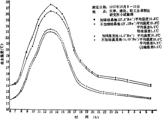 释义 | 着色水体的蒸发 水体中加入某些深色水溶性色素,可增加对太阳辐射的吸收,提高蒸发效果,对白底池和浅水的效果更为明显。在不同的色泽中,效果顺序大致为:黑、深蓝、紫、棕、绿、红、黄。但同一色素因加入量、水深和气候的不同,蒸发效果也有差别。海盐场过去曾在卤水中加入一种绿色溶剂——苏利瓦浦绿(Soliuap green),效果如下。 (一)光谱吸收与反射损失率的差别 加绿水体可更多地吸收短波辐射,与纯水对比曲线如图2-4-12,反射损失率测定如表2-4-44。 表2-4-44 不同着色浓度、不同深度卤水的太阳辐射损失率 (二)不同辐射强度与不同颜色池底的水温差 水体吸收辐射的差别可由水温表现出来。在强辐射下,染色水与非染色水吸热差别大,温差也大。夜间没有太阳辐射,也没有辐射吸收差别。轻工业部制盐研究所曾在白天的不同时间,以黑白球温度观测辐射强度,并对相同深度、浓度的加绿与不加绿结晶池的水温进行观测,数据如表2-4-45。 表2-4-45 太阳辐射强度与染色水体的温差 反射较强的白底结晶池与反射较弱的泥底蒸发池,在其他条件相同的情况下,加绿量为1/30000的池子分别与不加绿池子对比,一日之内水温变化曲线如图2-4-13。 图2-4-13 不同条件下加绿与不加绿水温曲线图 (三)染色浓度与水深的关系 染色水的蒸发效果不完全决定于染色浓度,还与水体深度有关。根据蒸发皿实验,2cm水深加绿1/30000和4cm水深加绿1/60000(水深增一倍,绿量减一半),后者的蒸发略大于前者。测定数据如表2-4-46。 表2-4-46 不同染色浓度、不同水深实验结果 (四)不同比重染色卤水不同天候的蒸发差别 根据相同水深(3cm)、相同加绿量(1/30000)、不同比重卤水的蒸发皿实验,不同天候下的蒸发增效不一:但平均结果可以看出,高浓度卤水的增效高于低浓度卤水。晴天高于昙天阴天。实验统计结果如下表2-4-47。 表2-4-47 不同浓度染色卤水不同天候试验结果 (五)混水与清水蒸发的差别 水体中悬浮的泥沙可阻挡太阳辐射进入水体,对蒸发效果略有影响。以泥底蒸发皿进行的9次试验,综合结果如表2-4-48。 表2-4-48 混水、清水蒸发对比测定 (六)不同高度蒸发与气象因子梯度变化 盐田卤水面上不同高度处的蒸发观测表明:蒸发量随高度增加而增大,0~50cm之间差值最大;不同的天气条件下差值不同,风速大则差值大,湿度大则差值小。综合结果如表2-4-49。 表2-4-49 水面以上不同高度蒸发测定结果 气象站地面70cm高处的蒸发皿与地面蒸发皿的对比观测也表明:地面皿的蒸发量一般较低,雨后地面湿度大时差值更大;但在高温季节,地面皿吸收地面辐射,蒸发量可大于高皿。 水面以上1cm及10、20、30、50、100、150、200cm处的温度梯度变化甚小,据测定,一日内上下温差仅1℃左右。主要因为在太阳照射下,辐射热被水体吸收,无地面辐射影响;夜间空气降温时,水体缓慢放热及水汽的对流交换,调剂了上下温差。根据5月份一日24小时的观测,2m以内气温的分层情况为:除下午14~19时底层气温略高于上层外,其余时间均为上层略高。 湿度的梯度观测说明,水面上1cm处的相对湿度恒大于上层空间,较2m高处约大10%,但随天气条件不同而有变化,50~200cm处各层湿度相差不大。5月份正常气候下24小时测定结果如表2-4-50。 表2-4-50 水面以上相对湿度梯度及气象站观测值(%) 水面上2m高处风速与气象站(在离地面12m高处)风速对应测定值如表2-4-51。 表2-4-51 水面上2m高处风速与气象站对比测定值(m/s) 测定数值表现为风速愈大,则较差愈大,如图2-4-14。 图2-4-14 两种高度风速较差图 |