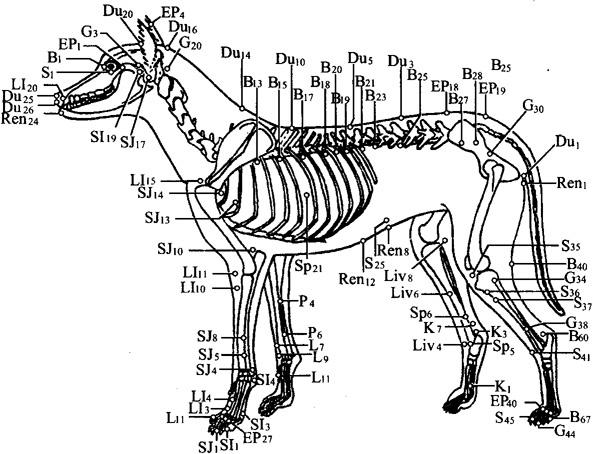 图12.1 犬的骨骼及实验针灸穴位