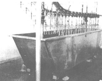 释义 | 石蜡净残羽系统 该系统主要由浸蜡箱、冷蜡箱和脱蜡机等组成,专门用于鸭、鹅等水禽机械脱羽后,去除禽体体表残存的细绒毛。经过石蜡净残羽系统的处理,鸭、鹅等水禽的羽毛脱净率可达到99%以上。 1.浸蜡箱 浸蜡箱主要由长方形盛蜡容器、熔蜡加热系统等组成。操作时,脱羽后的水禽顺着流水线的运转依次下降进入浸蜡箱,经过一定时间的浸蜡过程,从另一端上升离开浸蜡箱后进入冷蜡工序。 2.冷蜡箱 冷蜡箱主要由长方形容器、制冷系统等组成,结构如图3-2-36所示。操作时,浸蜡后的水禽顺着流水线的运转依次下降进入冷蜡箱,经过往返运转冷却,促使蜡凝固,将羽毛粘在蜡壳上,然后从进入端上升离开冷蜡箱进入脱蜡工序。 图3-2-36 冷蜡箱结构图 3.脱蜡机 脱蜡机是一种特殊的脱羽机,可将粘有羽毛的蜡壳除去。 |