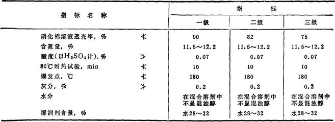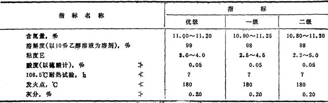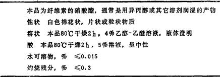 性能 白色或微黄色絮状纤维,密度1.66g/cm3,熔点160~170℃,自燃点170℃,闪点12.78℃,爆速6300m/s(含氮13%时),爆热4052.8kJ/kg(含氮13%时)。灰分一般为0.10~0.20%(主要是CaCO3和CaSO4)。由于在硝化过程中,混合酸内硝酸用量与纤维素的比例、硝化温度及硝化时间等的不同,所生成物的含氮量的范围由6~13.8%,溶解性也随之不同,如含氮量10.7~11.2%,全部能溶于乙醇和芳香族碳氢化合物的混合液及乙醇中;含氮11.2~11.7%,用乙醇溶解最为合适,也能溶于酯类(乙酸乙酯、乙酸丁酯、乙酸戊酯等)、丙酮、乙醇和醚的混合物及其它溶剂;含氮11.8~12.3%能溶于酯类、丙酮、乙醇和酯类的混合液、甲苯和矿物溶剂的混合液;含氮13~13.7%能溶于丙酮及乙酸乙酯中,而不能溶于乙醇和醚的混合液。