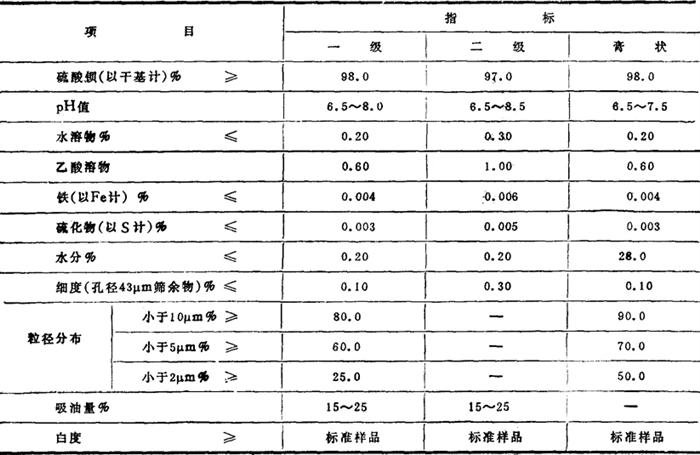 一、物理性质 为白色粉末状。属正交或单斜系结晶。密度为4.5g/cm3。熔点1958℃,于1149℃转为单斜晶体。难溶于水和酸,溶于发烟硫酸和熔融的碱,微溶于沸腾的盐酸。易与高锰酸钾、碳酸钙或碱金属硝酸盐制成混晶。其他物理数据如下: 相对密度 4.499 热膨胀系数 40℃ 54.18度-1 压缩系数 0℃,125MPa 1.8×10-4cm2/10-5N 晶格常数 a=0.8862nm b=0.5452nm c==0.7154nm 水中溶解度: 硫酸中溶解度20℃ 285.1g/L 甲酸中溶解度18,5℃,95%甲酸 0.10g/L 在水-酒精中的溶解度: 在硝酸、盐酸中的溶解度: 在氢溴酸,氢碘酸中的溶解度(沸点时): 熔点 1580℃ 比热 0~1000℃ Cp=0.4650+0.000140t J/g 克分子热容、焓、熵、自由能: 溶解热 23.35J/mol 转化热 40.58kJ/mol 生成热 1114.99J/mol 电离热 ⊿H电离=105502.32-695.357T+1.2118T2 折射率 α=1.6369,β=1.6381,γ=1.6491 吸收光谱λ 0.24×10-6nm 介电常数 405300Pa 11.4 导电率: 二、化学性质 不活泼,很稳定,在空气中遇硫化氢或有毒气体也不变色。与碳共热,可还原为硫化钡。 BaSO4+2C→BaS+CO2 三、用途 可作油漆、油墨橡胶、塑料、绝缘带的填充剂,印象纸及铜版纸表面涂布剂,纺织品上浆剂,深井钻采的加重剂。还用于颜料、陶瓷、蓄电池、搪瓷,玻璃及香料等工业中,用于制造明亮着色化合物。由于x射线被钡大量吸收,故用于x射线照相时,涂覆在消化道上,以增加反差度。 四、质量标准 我国沉淀硫酸钡国家标准(GB2899-82) 适用于油漆、油墨、颜料、橡胶、蓄电池、塑料和铜版纸等工业用途的沉淀硫酸钡。要求外观为无定形白色粉末,化学指标符合表1-1-51的要求。 表1-1-51 沉淀硫酸钡化学指标 日本沉淀硫酸钡及重晶粉国家标准JIS K5115-78(工业规格)见表1-1-52。 表1-1-52 日本沉淀硫酸钡及重晶石粉国家标准 |