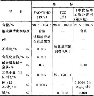 释义 | 硫酸铜 编码 GB 16.000;INS 519 化学结构 CuSO4·5H2O 相对分子质量 249.69 性状 蓝色结晶或颗粒,或深蓝色结晶性粉末,有金属味,相对密度2.284。在干燥空气中缓慢风化,高于150℃,形成易吸水的白色无水硫酸铜,650℃分解成氧化铜。易溶于水(20℃,26.3g/100g)呈酸性,溶于稀乙醇,不溶于无水乙醇。0.1mol/L水溶液的pH为4.17(15℃)。 制法将氧化铜溶于稀硫酸制成。 质量标准 鉴别方法 本品5%溶液呈铜盐反应和硫酸盐反应。 1.铜盐反应 向本品溶液中添加新配制亚铁氰化钾溶液(1+10),产生红棕色沉淀。向一部分沉淀中加稀乙酸(1+20),沉淀不溶。向另一部分沉淀添加氨试液(40mL氨水加水制成100mL溶液),沉淀溶解,溶液的颜色变深蓝。 2.硫酸盐反应 参见硫酸铝钾。 毒理学依据 1.LD50 大鼠口服333mg/kg(bw)。 2.ADI 不能提出(FAO/WHO,1994)。 使用 铜强化剂。 1.使用注意事项 (1)铜可促进结缔组织的形成和骨骼的正常发育,并可维持中枢神经系统健康,缺乏时可有使生长迟缓等影响。 (2)过量摄食本品可引起中毒。 2.使用范围及使用量 我国《食品营养强化剂使用卫生标准》(GB 14880-94)规定:可用于乳制品,使用量12~16mg/kg;婴幼儿食品,7.5~10mg/kg;饮液,4~5mg/kg(以元素铜计);乳制品、婴幼儿食品,3~4mg/kg;饮液1~1.25mg/kg。 |