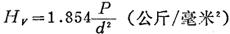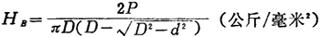 将直径D毫米的钢球放在试样表面上,然后加以P公斤的荷重,设试样上被压出的凹坑球面的面积为f,则布氏硬度HB(或BHN)由p/f求得。