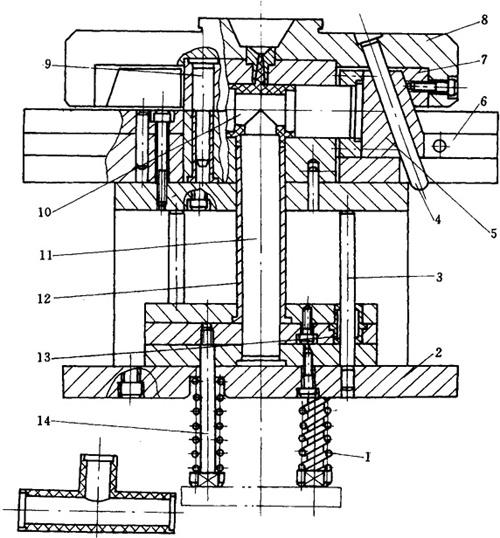1—弹簧 2—动模板 3—支柱 4—斜导柱 5—右侧滑动成型芯 6—导轨 7—镶块 8—定模 9—导柱 10—左侧滑动成型芯 11—下成型芯 12—推套 13—导套 14—顶杆