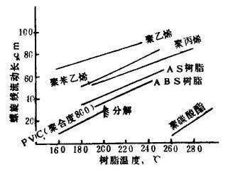 由于硬质聚氯乙烯塑料的熔融粘度较高,因此加工比较困难。再者,它的熔融温度与分解温度比较接近(相差约30℃),所以不能用提高温度的方法来降低粘度。聚氯乙烯塑料在高温下的停留时间不能太长,否则会发生降解。因此其注射成型就比其它塑料(如聚乙烯、聚苯乙烯、聚丙烯等)困难得多。图5-2-1、图5-2-2分别表示各种塑料的流动性、硬聚氯乙烯的热稳定性与温度和时间的关系。有关注射硬聚氯乙烯所用的设备参见本章第一节。